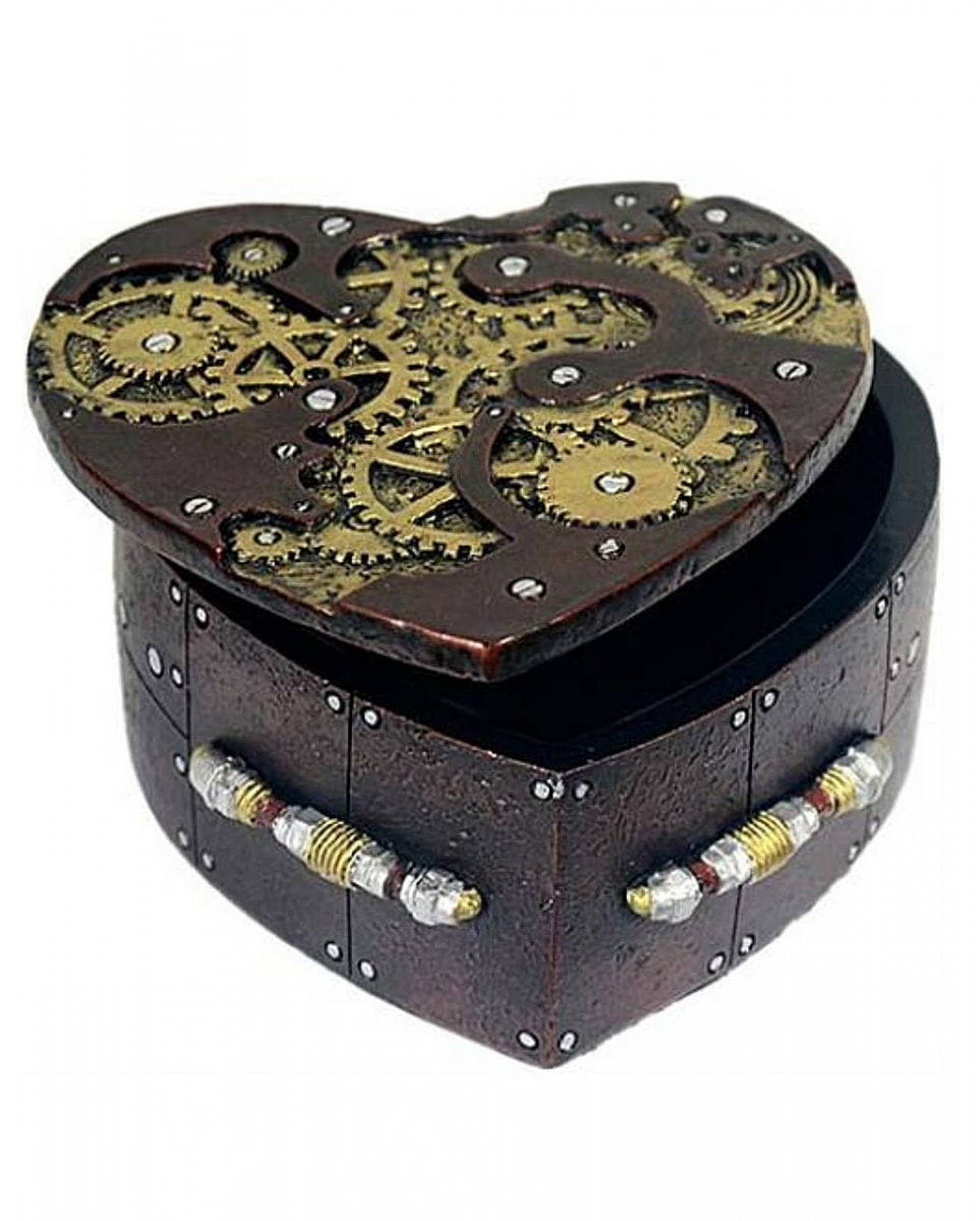 Herzförmige Steampunk Box mit Zahnrädern Herzkassette im Steampunk Design als Geschenk Verschenke die Herzförmige Steampunk Box mit Zahnrädern an Liebhaber des Steampunk Trends. Die kleine Herzkassette mit Zahnrädern ist ein schönes Mitbringsel für den Gastgeber der nächsten Kostüm Party. Sie kann als Schlüsselbox, Schmuckschatulle, oder geschmackvolles Deko Accessoire verwendet werden. Die Herzförmige Steampunk Box mit Zahnrädern ist eine ca 10 x 5 cm große Schatulle mit goldenen Zahnrädern. Die Box ist handbemalt und liebevoll ausgearbeitet. Du kannst Ketten, Taschenuhren oder Ohrringen ein stilvolles Zuhause geben, oder sie als Blickfang in die Vitrine stellen. Am Rand der Box befinden sich weitere Deko Elemente in metallischer Optik. Lieferumfang: 1 x Herzförmige Steampunk Box mit Zahnrädern Farbe: Braun/Gold/Silber Größe: ca. 10 x 5 cm Material: Polyresin von Hand bemalt Stilvolles Geschenk für Steampunk Fans Der Artikel ist ein Geschenkartikel und kein Spielzeug. Nicht für Kinder unter 3 Jahren geeignet. Kann Kleinteile enthalten, die verschluckt werden können – Erstickungsgefahr. Von Feuer und offenen Flammen fernhalten.
