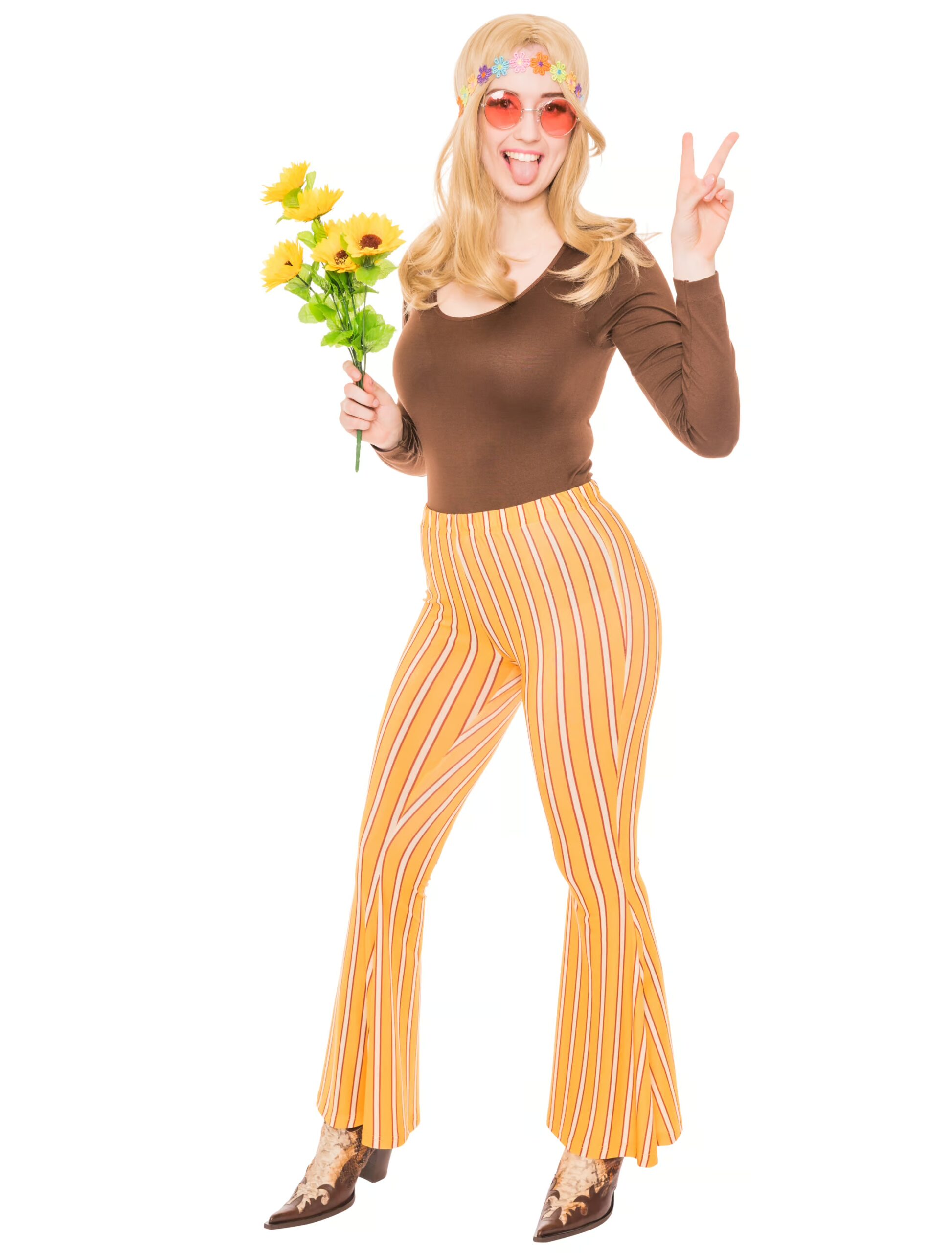 Bist Du bereit für eine aufregende Zeitreise in die wilden und kunterbunten 60er- und 70er-Jahre? Mit dieser farbenfrohen Schlaghose bist Du auf jeder Karnevals- oder Mottoparty garantiert perfekt gekleidet. Das bequeme Kleidungsstück für Damen besteht aus einer gelben, figurbetonten Hose, die knieabwärts weit ausgestellt ist. Highlights sind die weißen und roten Streifen, die einen tollen Kontrast bilden. Der bequeme Gummizug am Bund der Schlaghose garantiert einen hohen Tragekomfort. Zu Deinem Hippie Kostüm passen Accessoires wie Blumenketten, Haarkränze und eine getönte Brille.