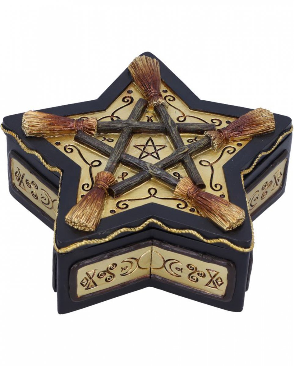 Okkultes Schmuckkästchen mit Hexenbesen Pentagram 16 cm Magische Schatulle mit Besen und Wicca Symbolik Unser okkultes Schmuckkästchen mit Hexenbesen und Pentagram ist praktisch zur Aufbewahrung von Schmuck und magischen Objekten. Platziere es dort, wo es gut zur Geltung kommt und deinem Raum eine magische Atmosphäre verleiht. Die Wicca-Schmuckdose ist ca. 16 x 16 x 7 cm groß und besteht aus Kunststein. Pentagrammförmig angeordnete Hexenbesen verleihen deiner Schatulle eine extra Portion Magie. Der Artikel ist von Hand bemalt und eine geniale Geschenkidee. Lieferumfang: 1 x Okkultes Schmuckkästchen mit Hexenbesen und Pentagram 16cm Farbe: Schwarz, Braun, Beige, Gold Größe: ca. 16 x 16 x 7 cm Material: Polyresin (Kunststein) Aufbewahrungsbox mit Hexenbesen und abnehmbarem Deckel Pentagramm-Symbolik und fünf Hexenbesen Aufbewahrung für Schmuck und Kristalle Aus Kunststein gegossen und handbemalt Wicca Geschenkidee Der Artikel ist ein Dekoartikel. Nicht für Kinder unter 3 Jahren geeignet. Kann Kleinteile enthalten, die verschluckt werden können – Erstickungsgefahr. Von Feuer und offenen Flammen fernhalten.
