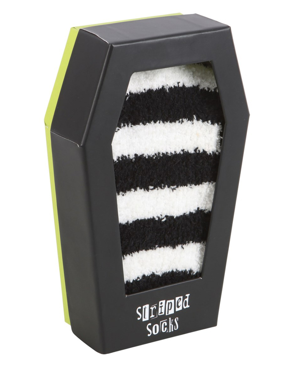 Schwarz-Weiß Gestreifte Socken in Sarg Box als Halloween Geschenk Kuschelige Socken mit Streifen als Mitbringsel für Gothics Wenn es um Gothic-Mode geht, dürfen bequeme Kuschelsocken nicht fehlen. Schwarz-Weiß gestreifte Socken in Sarg Box machen sich ideal als Halloween Geschenk und Mitbringsel. Jetzt zugreifen! Schwarz-weiß gestreifte Socken in Sarg Box als Halloween Geschenk sind in Einheitsgröße erhältlich. Sie bestehen aus 95% Polyester und 5% Elasthan. Sie sind weich, elastisch und können problemlos bei 30°C gewaschen werden. Lieferumfang: 1 x Schwarz-Weiß Gestreifte Socken in Sarg Box Inhalt: 1 Paar Farbe: Schwarz, Weiß Größe: One Size Material: 95% Polyester, 5% Elasthan Weiche Socken in schwarz-weiß Gestreifte Halloween Socken in Geschenkbox Sargf Geschenkbox Geniales Halloween und Gothic Accessoire Waschbar bei 30°C Nicht im Trockner trocknen