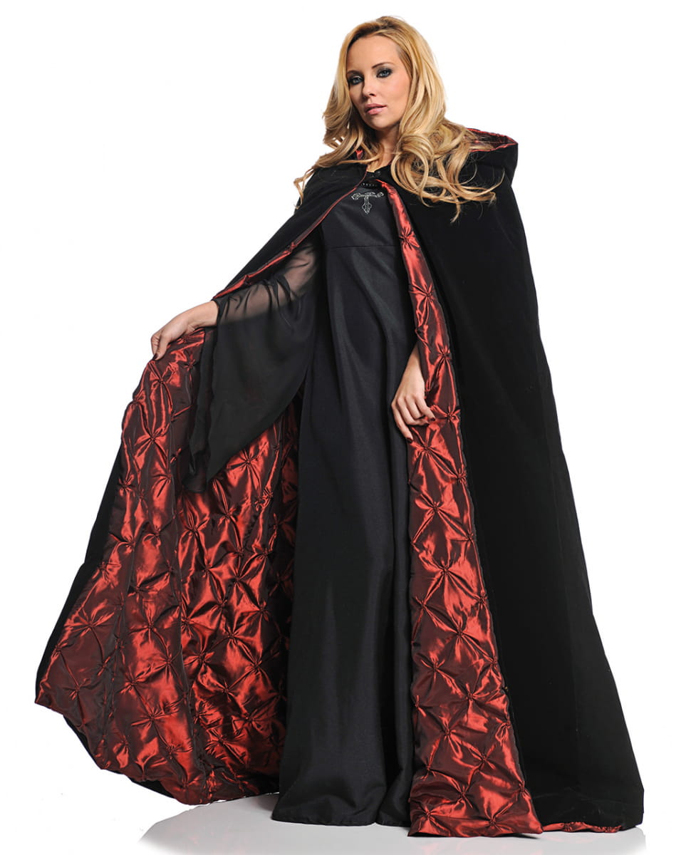 Schwarzer Deluxe Samt Kapuzenumhang Bodenlanger gefütterter Umhang einer Blutgräfin Mit dem eleganten schwarzen Deluxe Samt Kapuzenumhang hast du das perfekte Kostümzubehör für eine Vielzahl unterschiedlichster Verkleidungen. Mit dem edlen Samtcape komplettierst du dein elegantes Prinzessinnen Outfit, die böse Hexe und das verführerische Vampirkostüm aufs Trefflichste. Der Vampir Umhang fällt durch seine edle Optik auf und lässt jedes Halloween Kostüm noch eleganter wirken. Der schwarze Samt Umhang mit Kapuze besteht aus steifem, samtartigem Material. Gefüttert ist der schwarze Deluxe Samt Kapuzenumhang mit dunkelrotem glänzendem Satinstoff welcher rautenförmig gerafft ist. Die Raffung des Kapuzencapes verleiht ihm den exklusiven, eleganten Touch. Die Länge beträgt etwa 1,40m, der Umhang wird am Hals mit einem Knopf geschlossen. Weitere Capes wie der Dracula Wende Satin Umhang und der Schwarzer Kapuzen Umhang sowie andere Kostüme findest du in unserem riesen Sortiment. Lieferumfang: 1x Schwarzer Deluxe Samt Kapuzenumhang Farbe: Schwarz / Rot Grösse: Einheitsgröße, Länge ca. 1,40m Material: 100% Polyester