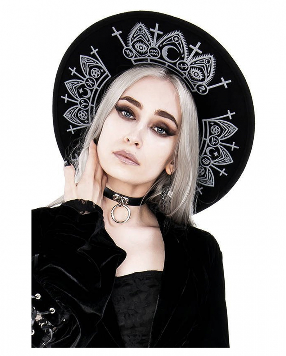 Schwarzer Wahrsage Hexenhut mit Astrologie Symbolen Moderner Fedora aus Wollfilz mit breiter Krempe und okkulten Symbolen als Kostümzubehör für Gothic Hexen Hol dir unseren schwarzen Wahrsage Hexenhut mit Astrologie Symbolen, wenn du eine magische Kopfbedeckung suchst. Die Hutkrempe ist ca. 10 cm breit und ist mit einem Druck verziert, der von gotischer Architektur und Astrologie inspiriert ist. Unser schwarzer Wahrsage Hexenhut mit Astrologie Symbolen ist aus 100% Wollfilz hergestellt und komplett gestärkt. Die okkulten Symbole, die sich über die Hutkrempe erstrecken, machen diesen besonderen Hexenhut zum Hingucker deines Gothic Outfits. Lieferumfang: 1 x Schwarzer Wahrsage Hexenhut mit Astrologie Symbolen Farbe: Schwarz, Weiß Hutgröße: 57 Material: 100% Wollfilz Hochwertiger Hexenhut mit okkulten Symbolen Breite Hutkrempe von ca. 10 cm Aus schwarzem Wollfilz hergestellt Gestärkt, um seine Form zu behalten Vielseitig mit vielen Looks kombinierbar Der Artikel ist ein Modezubehör für Erwachsene und kein Spielzeug. Nicht für Kinder unter 3 Jahren geeignet. Kann Kleinteile enthalten, die verschluckt werden können – Erstickungsgefahr. Von Feuer und offenen Flammen fernhalten.