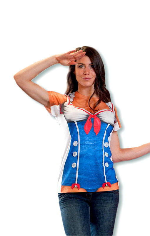 Matrosinen T-Shirt Heuere als süsse Seemannsbraut an Das Matrosinen T-Shirt hat vorne den Aufdruck eines sexy Seemannsbraut Körpers der in einem knappen blauen Kostüm steckt. Das Dekoltee ist weiss und wird von einer roten Schleife verziert. Auf unteren Teil des Kleid werden zwei Knopfleisten gezeigt, an deren Ende wieder zwei kleine rote Schleifen hängen. Am Rücken ist eine Matrosenscherpe abgebildet die ein Ancker schmückt, links und rechts jeweils ein Stern.Produktinformation: Material: 100% Polyester Farbe: Blau/Weiss/Ro beidseitig bedruckt Maße: Größe S: Gesamtlänge: ca. 66cm, Taille: ca. 40cm, Schulterbreite: ca. 35,5cm, Brustbreite: ca. 43cm, Kragenbreite: ca. 15cm, Äemellänge: ca. 15cm Größe M: Gesamtlänge: ca. 66,5cm, Taille: ca. 40,5cm, Schulterbreite: ca. 35,5cm, Brustbreite: ca. 44,5cm, Kragenbreite: ca. 15cm, Äemellänge: ca. 15,5cm Größe L: Gesamtlänge: ca. 67cm, Taille: ca. 44,5cm, Schulterbreite: ca. 35,5cm, Brustbreite: ca. 48cm, Kragenbreite: ca. 16cm, Äemellänge: ca. 16,5cm