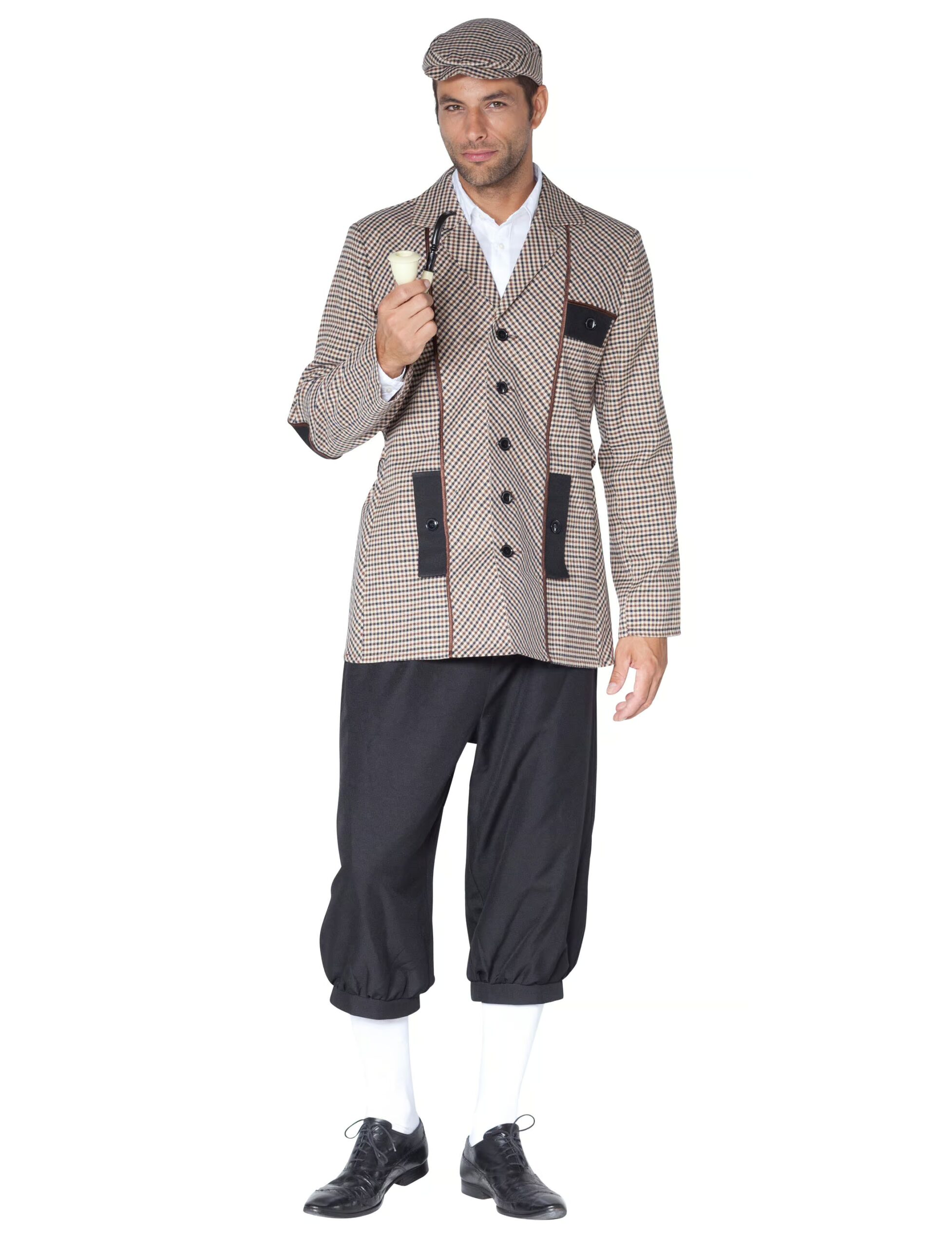 Wie viel Detektiv steckt in Dir? Finde es heraus mit dem authentischen Sherlock Holmes Kostüm für Herren! Das Kostüm ist dreiteilig, bestehend aus einem Jackett, einer Hose und einer Mütze. Das Jackett ist aus einem braun-weiß karierten Stoff gefertigt, der in der Front mit schwarzen Knöpfen versehen ist. Durch diese lässt sich das Jackett auch bequem schließen. Zusätzlich ist dieses im Brust- und Hüftbereich sowie an den Ellenbogen mit schwarzem Stoff verziert. Der schicke Look des Oberteils wird durch den Gürtel auf der Rückseite, den braunen Nähten sowie durch das Revers verstärkt. Passend zu den schwarzen Applikationen ist die Sherlock Holmes Hose aus schwarzem Stoff gefertigt. Die Hose reicht bis über die Knie. Darunter sehen weiße Strumpfhosen und schicke Schuhe besonders gut aus. Auch die passende Detektiv Mütze liegt dem Kostüm dabei. Mit diesem Kostüm kannst Du Dein besonderes detektivisches Gespür auf der nächsten Party unter Beweis stellen. Nicht nur Dr. Watson wird Dich in
