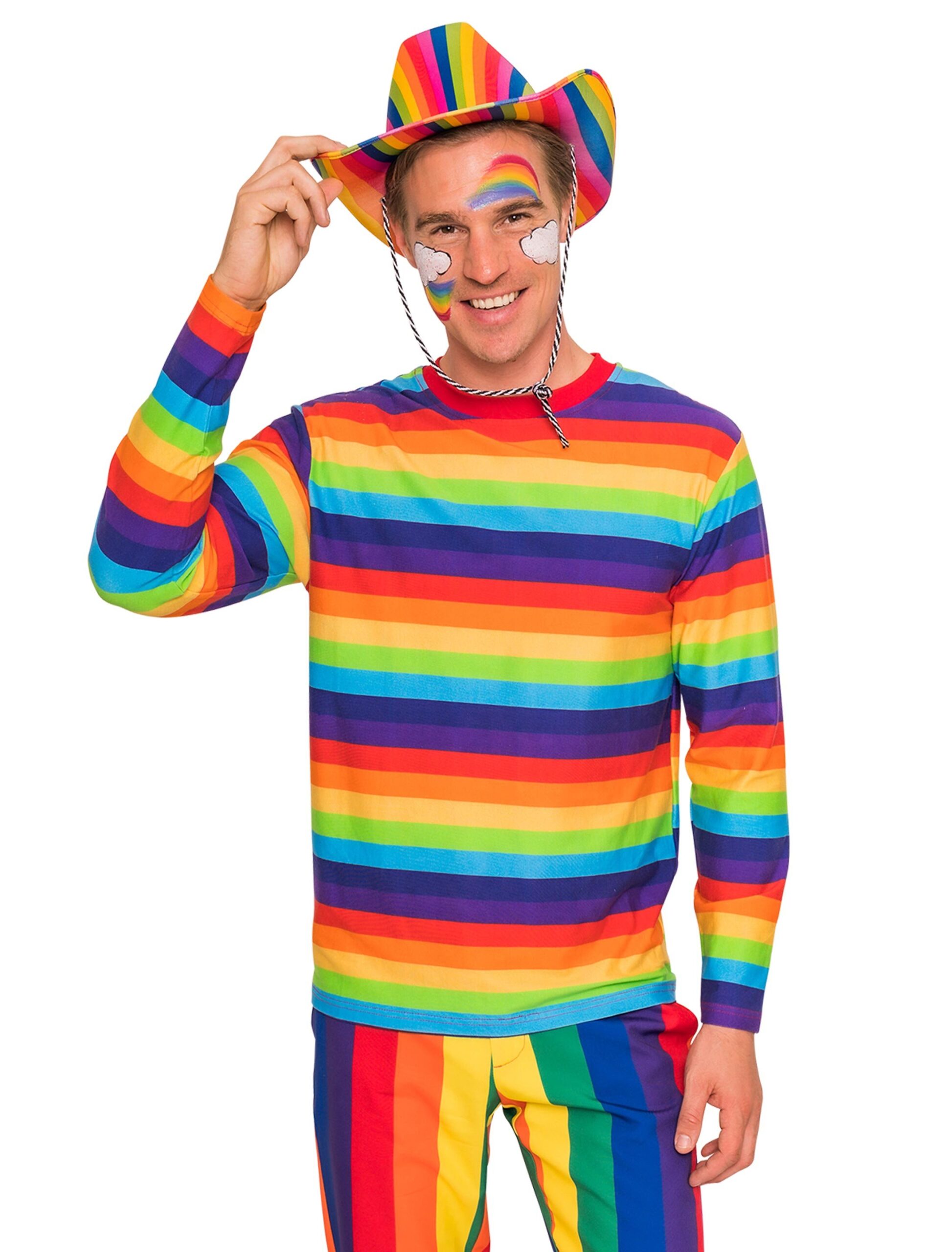 Als fröhlicher Clown bist Du nicht nur der Star auf jeder Kinderparty, auch im Karneval und auf Motto-Partys bist Du ein gern gesehener Gast, dem die Herzen der Damen zufliegen. Zum wundervollen Eyecatcher wirst Du in diesem bunten, quergestreifte Herrenshirt, das alle Farben des Regenbogens in sich vereinigt und eines Clowns würdig ist. Das farbenfrohe Shirt besteht aus einem angenehm zu tragenden Baumwoll-Elasthan-Mix, ist gerade geschnitten und mit langen Ärmeln sowie einem Rundhalsausschnitt ausgestattet. Es ist das perfekte Oberteil, um Dein Clownskostüm optimal und wirkungsvoll zu vervollständigen.