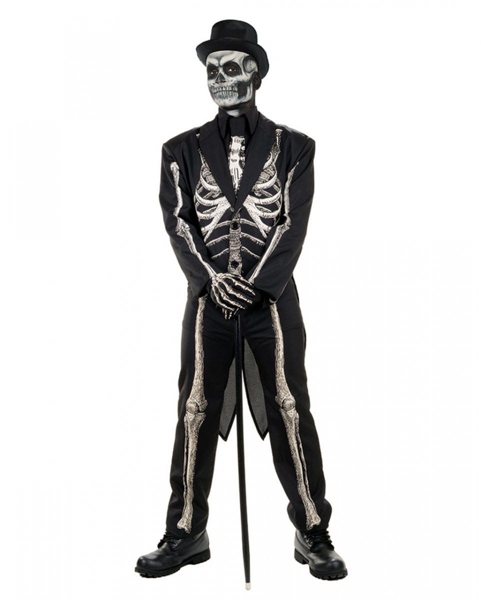 Skelett Anzug Kostüm Frack für Halloween Geschmackvoller schwarzer Frack mit Gebein Aufdruck Wer selbst über den Tod hinaus Wert auf eine stilvolle Kleidung legt, hat mit unserem Skelett Anzug Kostüm Frack für Halloween genau die richtige Verkleidung! Stelle auf den kommenden Halloween und Horror Festen einen skelettierten Gentleman dar! Das Skelett Anzug Kostüm Frack für Halloween besteht aus mehreren Teilen. Der Stretchanteil in der schwarzen Hose des Skelett Kostüms sorgt für ein angenehmes Tragegefühl. Darüber wird ein klassischer schwarzer Frack mit den charakteristischen Schwalbenschwanz-Schößen getragen. Darunter verbirgt sich ein schwarzes Hemd mit angehängter ebenfalls schwarzer Krawatte. Besonderes Highlight hierbei: Die Wirbelsäule setzt sich als Aufdruck auf der Krawatte fort! Schwarze Handschuhe mit Knochenaufdruck komplettieren das gruselige Erscheinungsbild. Lieferumfang: 1x Skelett Anzug Kostüm Frack für Halloween Inhalt: Jacket, Hemd mit Krawatte, Hose, Handschuhe (Hut, Spazierstock, Maske und Schuhe NICHT im Lieferumfang enthalten!) Farbe: schwarz/weiß Material: 100% Polyester Grössen: ONE SIZE (50-54) XXL (52-54) entspricht XL Brustumfang: ca. 107 – 117 cm ca. 127 – 133 cm Taillenumfang: ca. 86 – 98 cm ca. 112 – 118 cm Halsumfang: ca. 42,5 – 43,5 cm ca. 46,5 – 47,5 cm Der Artikel ist für Erwachsene hergestellt und ist kein Spielzeug. Nicht für Kinder unter 3 Jahren geeignet. Enthält eventuell Kleinteile, die verschluckt werden können. Es besteht dadurch Erstickungsgefahr.