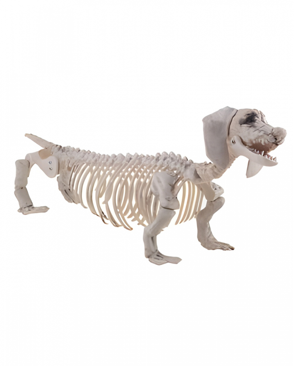 Kunststoff Dackel Hundeskelett als Halloween Dekoration Künstliches Tier Skelett aus realistischen Knochen Neben Ratten, Käfern und Fledermäusen gehören zu Halloween auch süße Haustiere wie schwarze Katzen und Hunde. Das Kunststoff Dackel Hundeskelett war früher vielleicht auch mal mit weichem Pelz überzogen. Mittlerweile ist vom kleinen Waldi nur noch das Knochengerüst übrig… Das realistische Kunststoff Dackel Hundeskelett ist beige bemalt und schattiert. Der Halloween Hund ist 55 cm lang sowie 25 cm hoch. Die Schulter- und Beckengelenke, Hals, Unterkiefer und Ohren sind mit Metallschrauben befestigt. Durch das offene Maul wirkt der Zombie Hund, als würde er süß hecheln – was ohne Fell ganz schön gruselig aussehen kann. Lieferumfang: 1x Kunststoff Dackel Hundeskelett als Halloween Dekoration Farbe: beige Größe: ca. 55 x 265 cm Material: Kunststoff und Metall Realistisches Tier Skelett aus Kunststoff Knochen