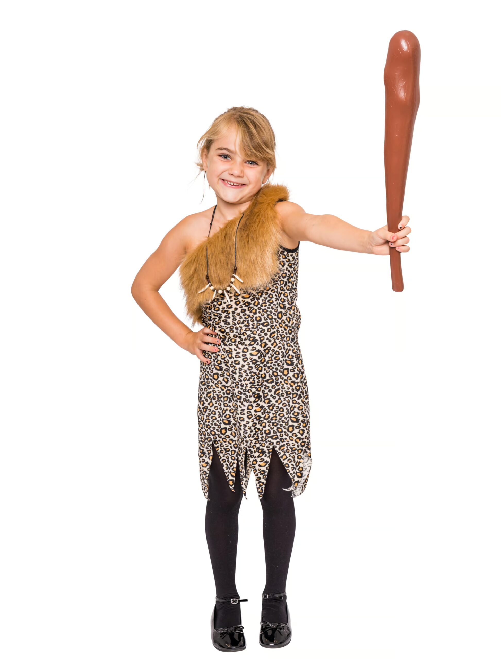 Mit diesem attraktiven, braunen Steinzeit-Outfit aus Polyester machst Du aus Deinem kleinen Liebling im Handumdrehen ein süßes Steinzeitmädchen, das zum Schulfasching, Kindergeburtstag oder auf Motto-Partys im Mittelpunkt steht und den Erwachsenen ein Lächeln ins Gesicht zaubert. In diesem hübschen, asymmetrisch geschnittenen Steinzeitkleid in aparter Leopardenfelloptik mit dem dekorativen Kunstfellbesatz im Brust- und Schulterbereich sowie dem Zackensaum wird sich Deine Kleine wie ein echtes Steinzeitgirl fühlen, das mit einer großen Keule und den passenden Accessoires aus dem noch mehr Spaß an der Kostümierung haben wird.
