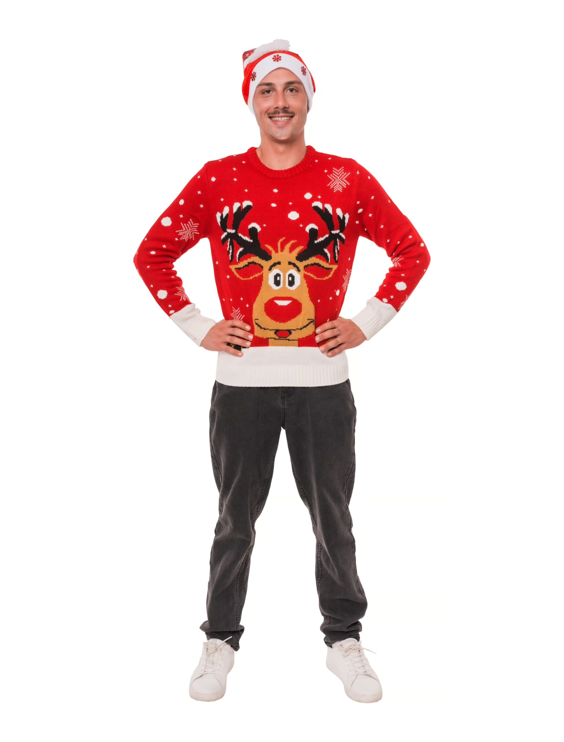 Mit unserem Strickpullover Rentier bringst du festliche Stimmung und eine Prise Humor in die kalte Jahreszeit. Vorne prangt ein großes Rentier, das sofort alle Blicke auf sich zieht, während die vielen Schneeflocken dem Pullover einen winterlich-verspielten Charakter verleihen. Ob du ihn stolz als weihnachtliches Highlight trägst oder ganz bewusst als „Ugly Sweater“ – gute Laune ist dir garantiert. Perfekt für Weihnachtsfeiern, Familienfotos oder den gemütlichen Abend auf dem Sofa – mit diesem Pullover zeigst du, dass du Sinn für Spaß und Stil hast!