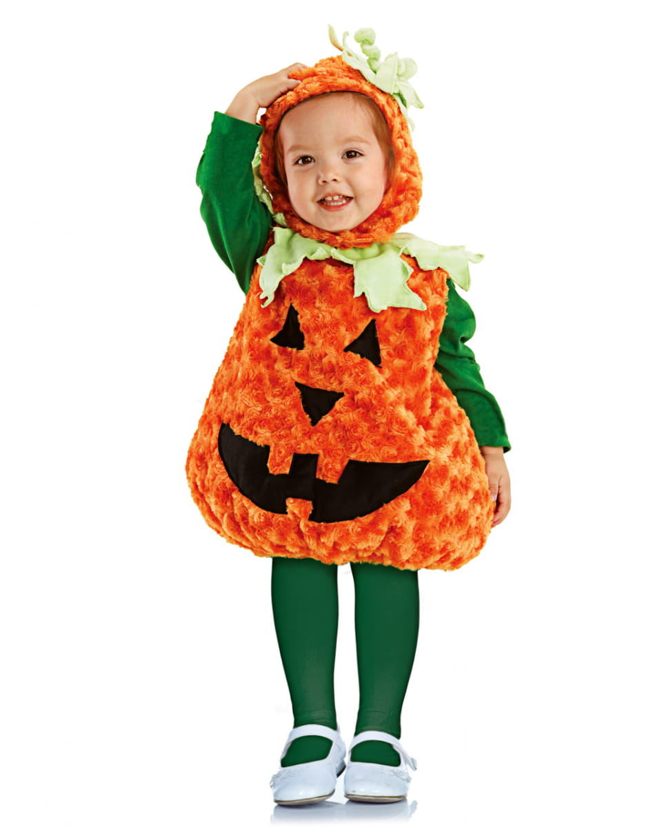 Niedlicher Kürbis Babykostüm aus Plüsch Größe M, L, XL Weiches Kürbiskostüm für Babys und Kleinkinder als Halloween Kostüm Verkleide deinen kleinen Liebling doch für seine erste Halloween Party als süßer Kürbis. Das niedlicher Kürbis Babykostüm kostümiert dein Kind als frechen Halloween Kürbis und lässt diesen damit passend zum Thema zur Halloween Party erscheinen. Das kuschelweiche Plüschkostüm des Halloween Kürbis macht dein Kind damit zum Hingucker des Kinderkarnevals und Halloween Events. Unser niedlicher Kürbis Babykostüm als kurzärmeliges Plüschkostüm besteht aus zwei Teilen. Das Kürbiskostüm selbst ist mit Watte gepolstert und besitzt einen praktischen Gummizug als Beinabschluss. Die Haube des Kostüms mit Klettverschluss stellt den Strunk des Kürbis dar und besitzt einen grünen Stiel mit Blätter. Wunderbares Halloween- und Faschings Kostüm für die Allerkleinsten. Lieferumfang: 1 x Süßer Kürbis Babykostüm Inhalt: 1 x Kostüm, 1 x Mütze Farbe: Orange/Grün Größe: M, L, XL Material: 100% Polyester, Schuhe, Strumpfhose, Sweat-Shirt nicht inkl. Größe: M 18-24 Mo L 2-4 Jahre XL 4-6 Jahre Maße: ca. 74-80 cm ca. 92-104 cm ca. 104-122 cm