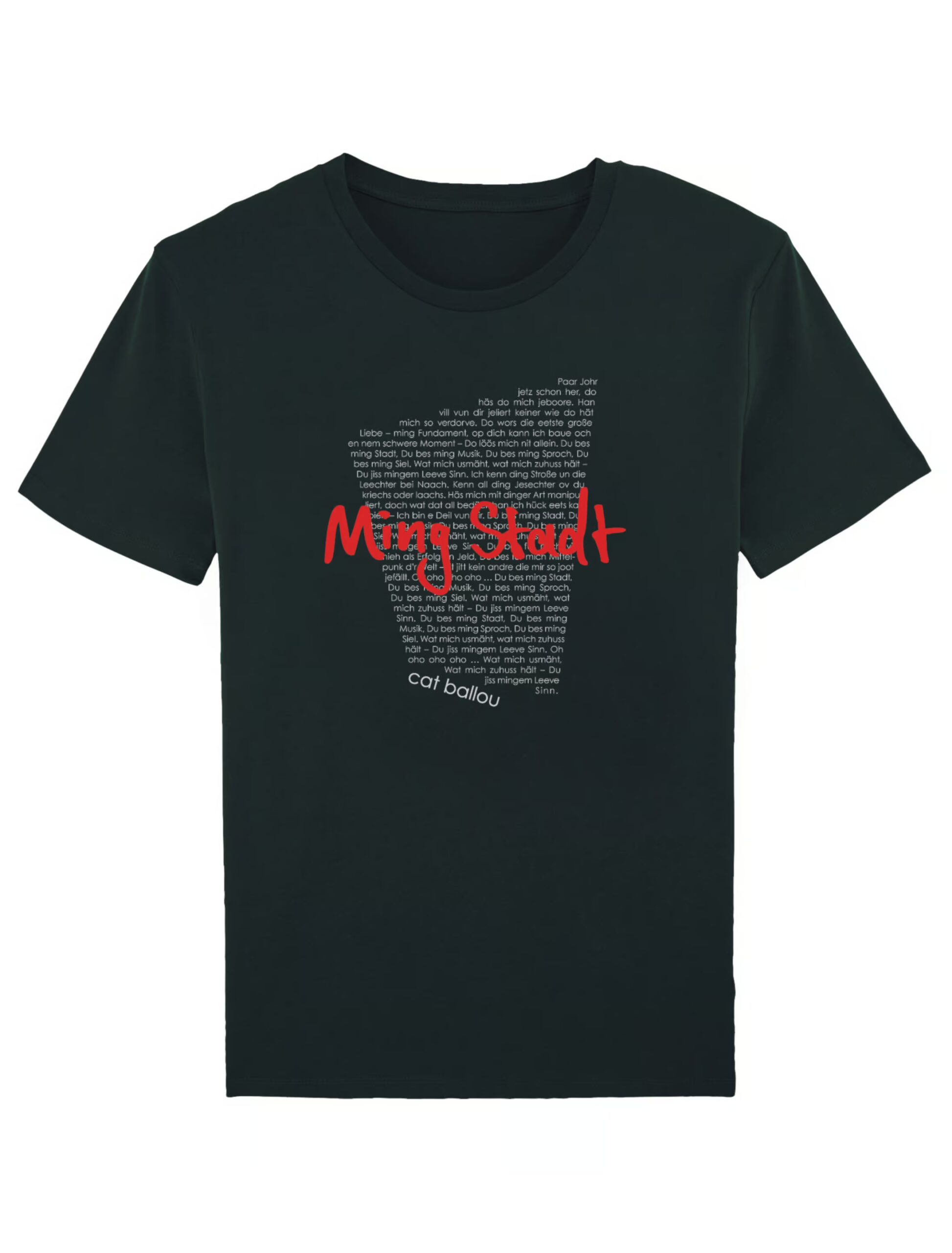 Jetzt bei uns: das Original Merchandise T-Shirt von Cat Ballou! Schlüpfe in das schwarze T-Shirt mit Rundhalsausschnitt. Das T-Shirt ist in der Front mit dem Song-Text “Ming Stadt” bedruckt. Ein Must-Have für jeden echten Cat Ballou Fan!