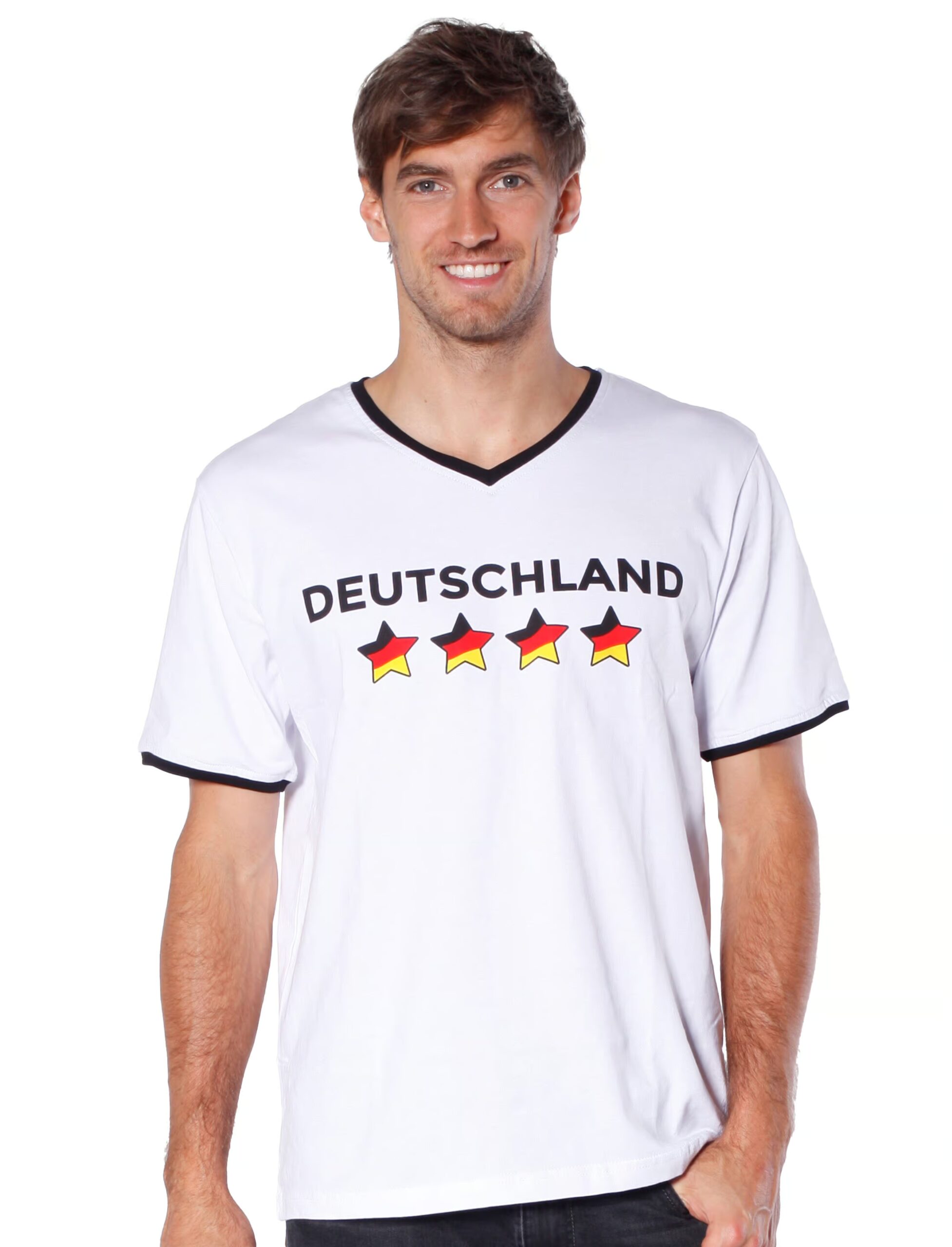 Du bist ein echter Deutschland-Fan? Und Du willst zeigen, dass Du ein Deutschland-Fan bist? Dieses weiße T-Shirt mit der schwarzen Aufschrift Deutschland auf der Brust sowie den 4 Sternen in den Farben Schwarz-Rot-Gold darunter, zeigt den Leuten da draußen, dass Du ein wahrer Deutschland-Fan bist! Das T-Shirt mit dem V-Ausschnitt darf bei keinem Deutschlandspiel fehlen.
