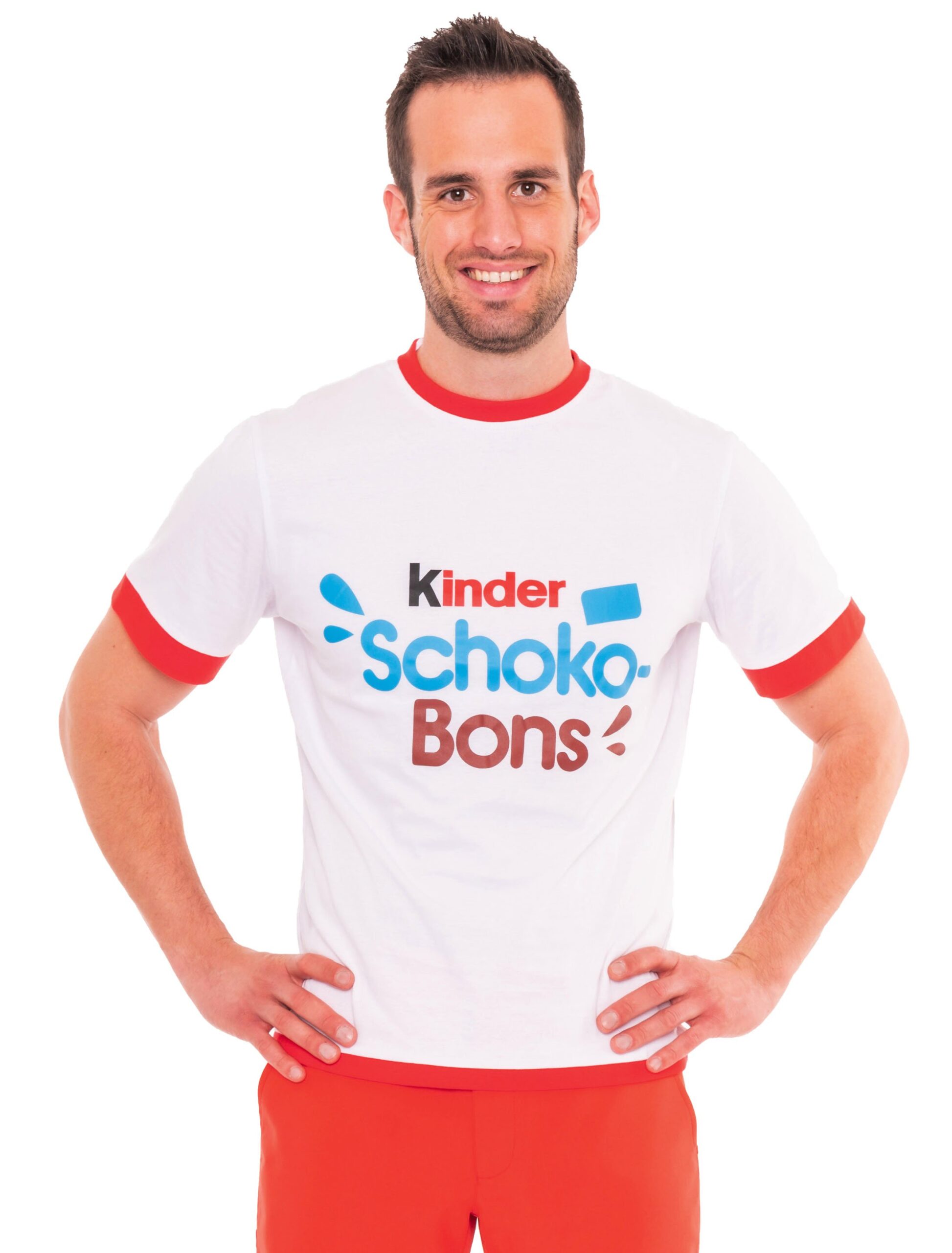 Ein Muss für jeden Fan von kinder Schoko-Bons! Dieses original Herren T-Shirt von kinder Schoko-Bons ist ein echter Hingucker. Das kurzärmelige Shirt ist in weiß gehalten und mit roten Säumen versehen. Es besitzt einen Rundhalsausschnitt und ist aus reiner Baumwolle gefertigt. Auf der Vorderseite ist das T-Shirt mit dem Logo von kinder Schoko-Bons bedruckt. Kombiniere das Shirt mit der passenden Hose und Hosenträgern. Ideal um sein eigenes Kostüm von kinder Schoko-Bons selbst zusammenzustellen! Offizielles Merchandise – Exklusiv bei uns!