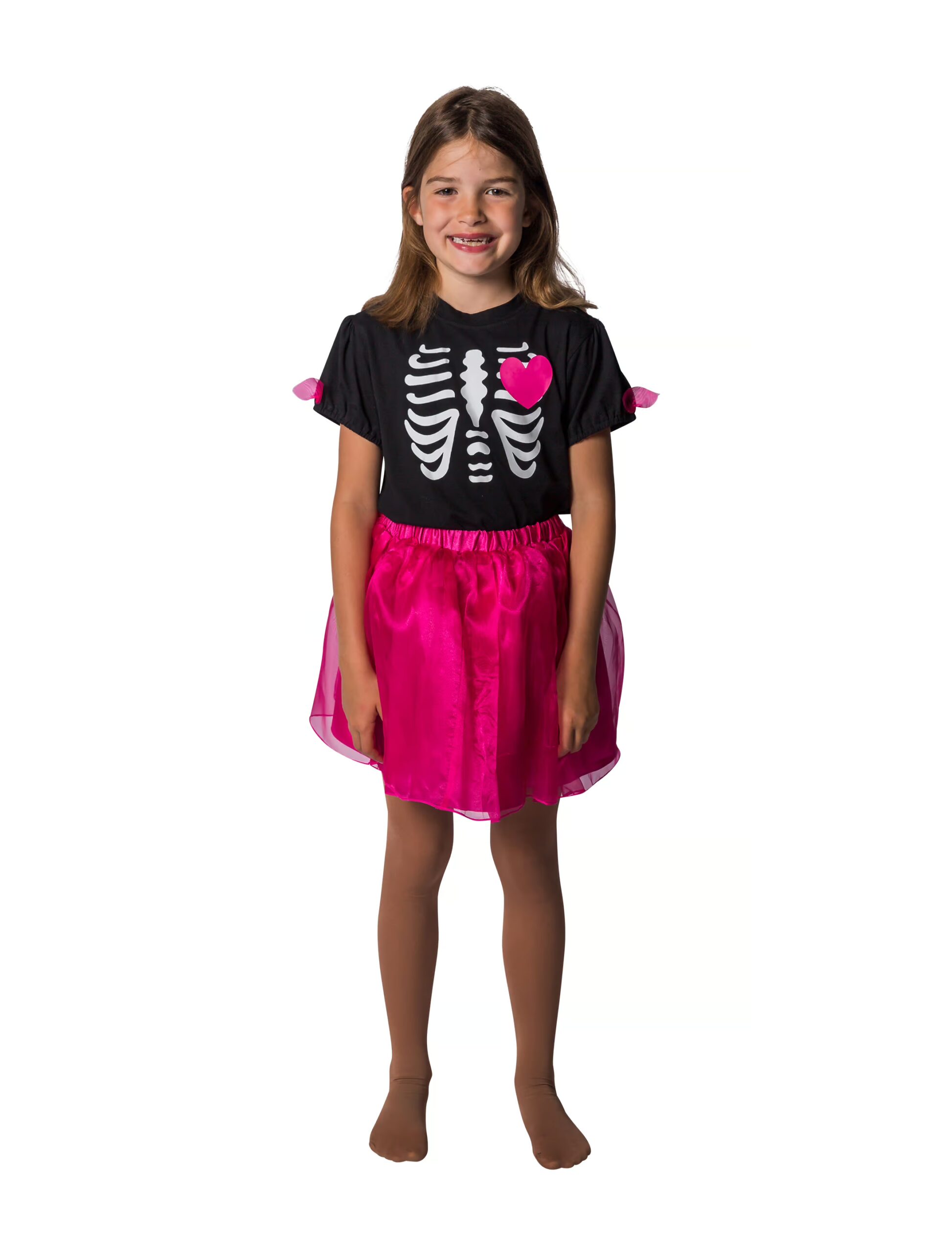 Lustig und schaurig zugleich ist unsere süße Skelett Kombi für Kinder, die sich aus einem T-Shirt mit Rock zusammensetzt. Das Outfit in den Farben Schwarz, Weiß und Pink eignet sich nicht nur für Karneval, sondern kann auch für Halloweenpartys prima genutzt werden. In mehreren Größen kann das Skelett Kostüm für Mädchen bei uns im Shop ergattert werden, das aus hochwertigem Polyester besteht. Das Shirt wird mit Knochen geschmückt und sorgt dafür, dass Du das Herz am rechten Fleck trägst. Das schwarze Shirt kannst Du in den Rock stecken oder lässig darüber tragen. Die Ärmelenden sind mit Gummizügen versehen. Der Rock besitzt einen Gummizug am Bund.