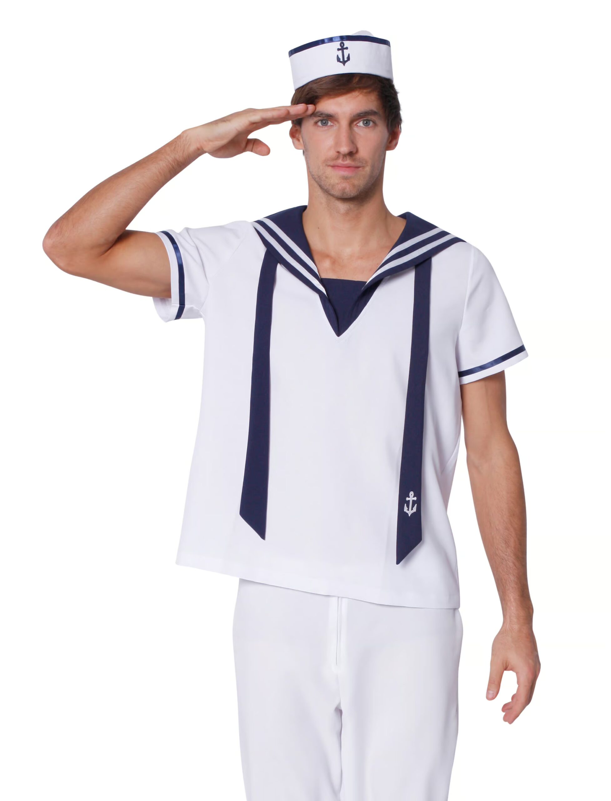 Ahoi und alle Mann an Bord! Dieses T-Shirt ist die perfekte Ergänzung für Dein Kostüm als tüchtiger Seemann. Das weiße Oberteil ist mit klassischen Streifen, einem großzügigen Ausschnitt und zwei dunkelblauen Bändern inklusive Anker-Symbol ausgestattet. Damit verwandelst Du Dich im Nu in einen echten Vorzeige-Matrosen!