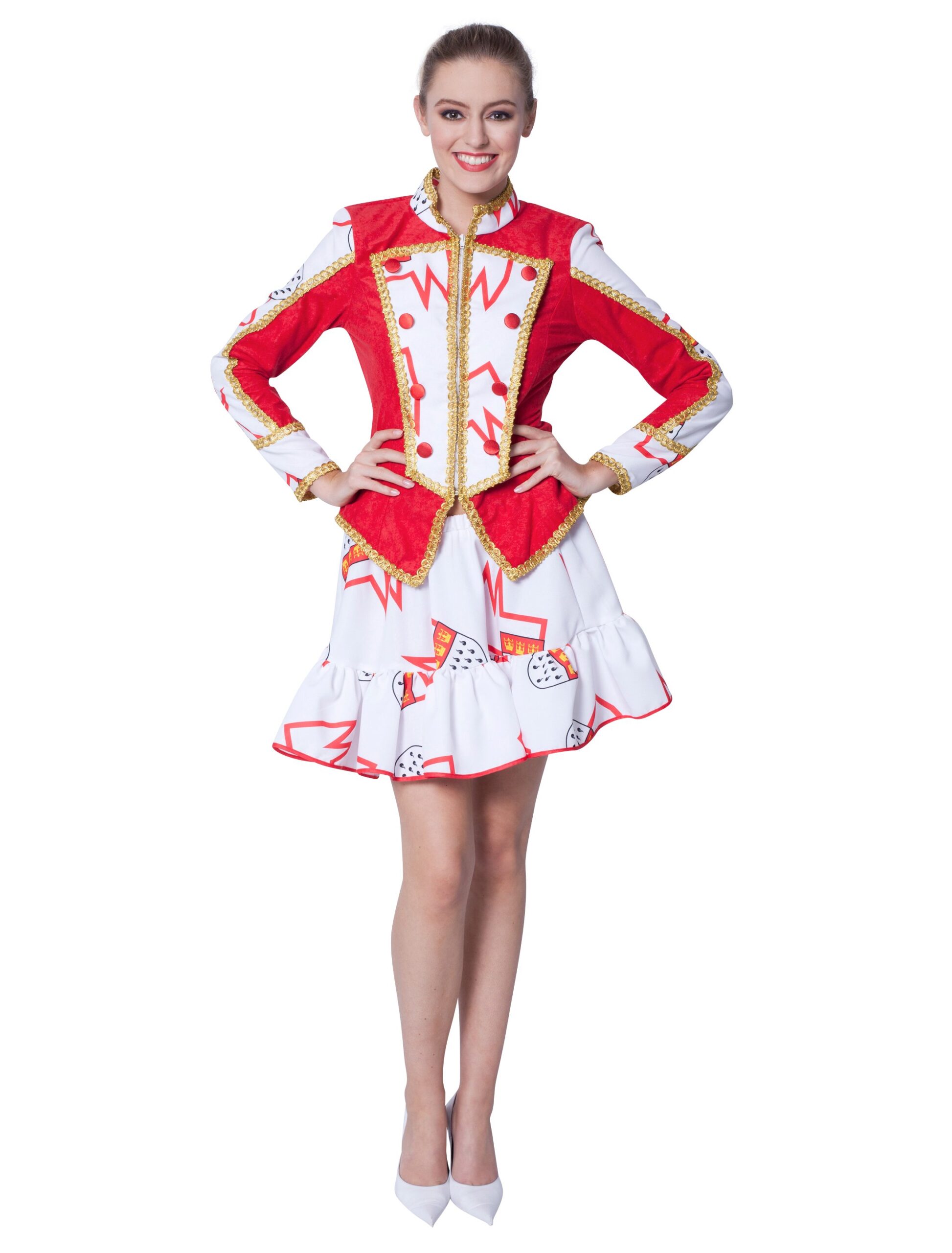 Was für ein süßes Mädchen! Mit diesem hübschen Tanzmariechen Kostüm tanzt Du Dich im Nu in die Herzen – insbesondere in die der Kölner! Kein Wunder, denn das zweiteilige Damen Kostüm ist sowohl auf der Jacke als auch auf dem Rock mit Kölner Wappen und den Umrissen des Doms verziert. Die figurbetonte Verkleidung, die sich durch einen Reißverschluss in der Front bequem schließen lässt, wird an den Säumen zusätzlich von goldenen Borten geziert, die sehr edel wirken. Der kurze und ausgestellte Rock betont perfekt Deine (Tanz-)Beine. Nicht nur die Kölner werden Dein Tanzmariechen Kostüm lieben! Ein schönes Tanzmariechen Kostüm zu Karneval oder Fasching.