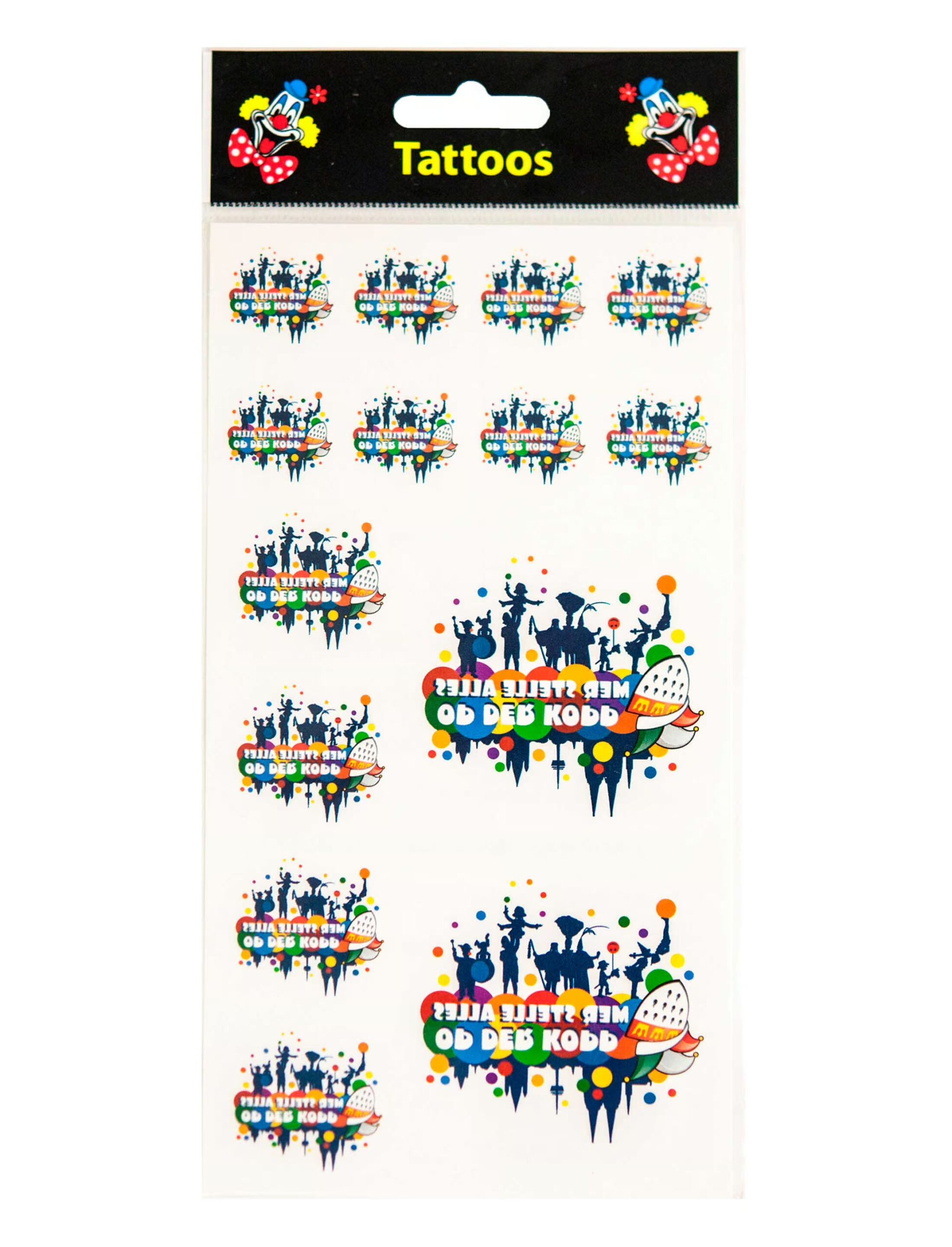 Köln ist rundum im Karnevalsfieber! Mit den passenden Motto-Tattoos zierst Du künftig auch Deine Haut! Die kunterbunten Motto-Tattoos eignen sich für jedes Alter und verbreiten Spaß bei Jung und Alt! Zu sehen sind die Kölner Skyline mit dem Dom, dem Fernsehturm und der Sankt Martin Kirche sowie fröhliche Jecke, die das Karnevalsfest erst perfekt machen. Die knalligen Farben, das bunte Konfetti, die Zipfelmützen und das Kölner Wappen sorgen für Partylaune! Das Motto der Session 2015/2016 steht in einer weißen, großen Schrift im Vordergrund des Tattoos und lautet: MER STELLE ALLES OP DER KOPP. Bist Du dabei? Die acht kleinen, die vier mittelgroßen und die zwei großen Tattoos finden überall ihren Platz und machen Dich zum kölschen Hingucker!