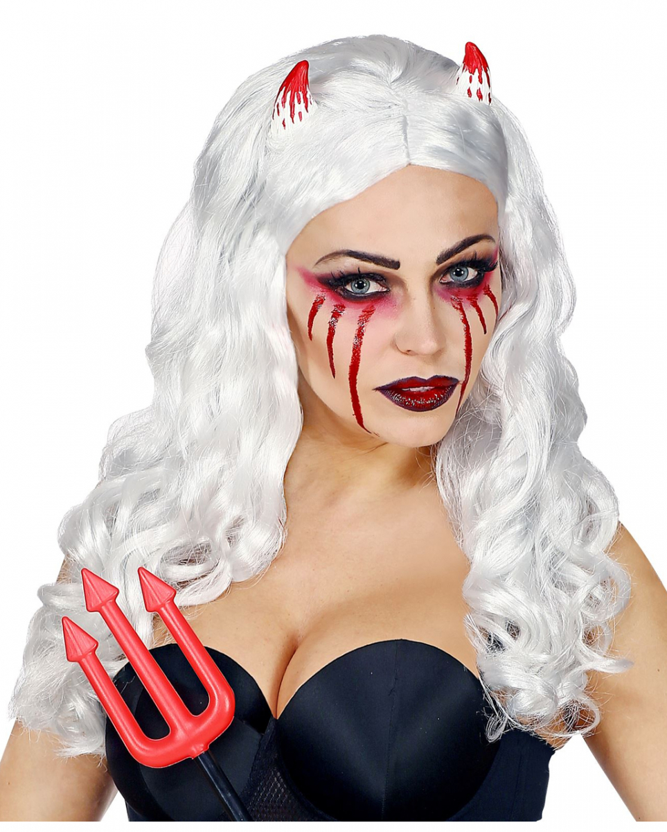 Teufelskönigin Perücke Weiß mit Hörnern Weiße Teufelin Perücke mit blutigen Hörnern Mit der Teufelskönigin Perücke Weiß mit Hörnern verwandelst du dich in eine sexy Satansbraut. Die gelockte weiße Faschingsperücke mit Hörnern ist ein echter Hingucker und ein geniales Kostümzubehör für Halloween und Karneval. Die Teufelskönigin Perücke Weiß mit Hörnern ist aus Kunsthaar und in One Size Größe für Damen verfügbar. Das Kunsthaar ist leicht gelockt und verfügt über zwei Hörner, an denen Blut heruntertropft. Trage die Langhaarperücke zu Teufelin kleidern oder sexy Jumpsuits. Lieferumfang: 1 x Teufelskönigin Perücke Weiß mit Hörnern Farbe: Weiß, Rot Größe: Einheitsgröße für Erwachsene Material: 100% Kunsthaar Teuflische Langhaar Perücke Perfekt für dein Halloween Teufelinnen Kostüm Dieser Artikel ist ein Kostümzubehör für Erwachsene. Es ist kein Spielzeug. Von offenem Feuer fernhalten. Nicht hitzebeständig, deshalb nicht mit Glätteisen oder Lockenstab behandeln.