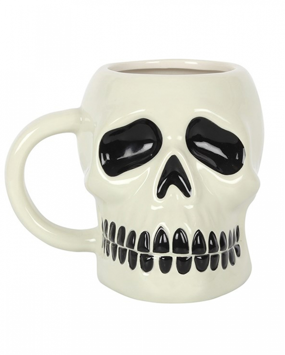 Weißer Totenkopf Becher aus Keramik als Gothic Geschenk Halloween Homeware für die Hexenküche und Hausbar Mit dem weißen Totenkopf Becher aus Keramik verschenkst du ein geniales Stück Halloween Homeware. Die Gothic Tasse sieht so müde aus, wie du dich fühlst? Der Schädel hat ein charmantes Grinsen aufgelegt, als wollte er sagen: Erst mal ein Käffchen. Der weiße Totenkopf Becher aus Keramik hat die Form eines Totenschädels. Die Augenhöhlen, die Nasenhöhle und die Zähne sind schwarz dargestellt. Der breite Henkel ist ideal, um die Tasse anzufassen und seinen Tee oder Kaffee zu genießen. Lieferumfang: 1 x Weißer Totenkopf Becher aus Keramik Farbe: Weiß, Schwarz Größe: 11 x 12 x 8 cm Material: Keramik Stylischer Keramikbecher im Totenkopf Design Gothic Accessoire und Halloween Homeware Klasse als Deko und Geschenkartikel Nicht für Spülmaschine und Mikrowelle geeignet Der Artikel ist ein Geschirr Artikel. Nicht für Kinder unter 3 Jahren geeignet. Kann Kleinteile enthalten, die verschluckt werden können – Erstickungsgefahr. Von Feuer und offenen Flammen fernhalten.