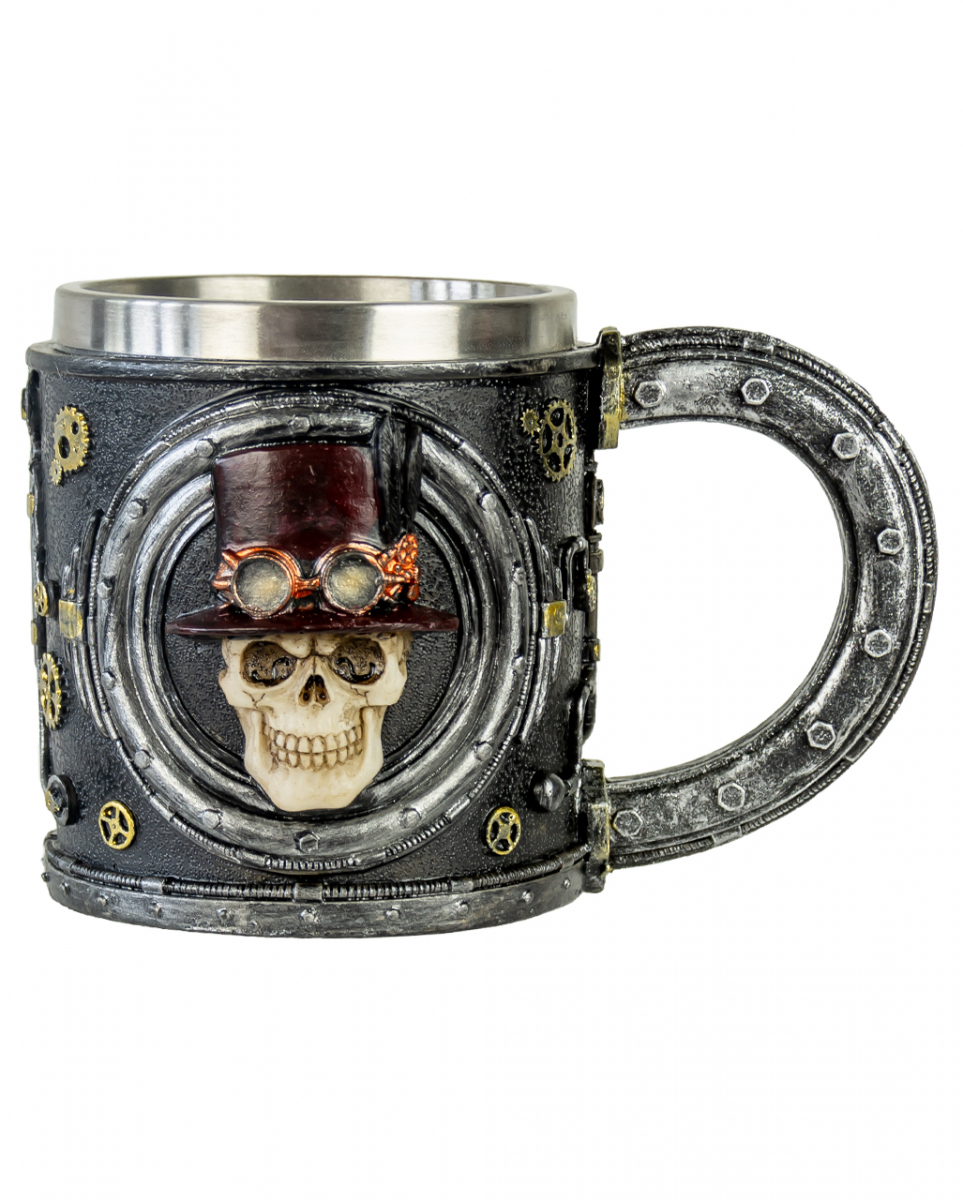 Totenkopf Steampunk Kelch mit Edelstahleinsatz 14 cm Neofuturistisch aussehendes Trinkgefäß mit Zahnrädern, Schläuchen und Totenschädel als Halloween Tischdeko Tauche mit unserem Totenkopf Steampunk Kelch mit Edelstahleinsatz ein in die düstere Welt des Steampunk. Der Krug ist eine atemberaubende Deko für Fans von Jules Verne und H.P. Lovecraft und ein praktisches Accessoire für Halloween und Fantasy Events. Unser Totenkopf Steampunk Kelch mit Edelstahleinsatz ist ca. 14 x 11 x 10 cm groß und aus hochwertigem Polyresin. Das Fassungsvermögen von ca. 390 ml ist perfekt für deine Lieblingsgetränke. Der herausnehmbare Edelstahleinsatz erleichtert die Reinigung. Lieferumfang: 1 x Totenkopf Steampunk Kelch mit Edelstahleinsatz 14cm Farbe: Schwarz, Silber, Braun, Kupfer Größe: ca. 14 x 11 x 10 cm Gewicht: 524 g Fassungsvermögen: ca. 390 ml Material: Polyresin (Kunststein), Edelstahl Außergewöhnlich aussehender Steampunk Krug als Trinkgefäß Neofuturistische Elemente wie Zahnräder, Schrauben und Schläuche als Verzierung Zwei Totenköpfe mit braunem Zylinder, schwarzer Feder und Schweißerbrille als Blickfang Extravaganter Steampunk Krug mit herausnehmbarem Edelstahleinsatz, der das Reinigen erleichtert Grandioses Geschenk, das gut zu unserem passt