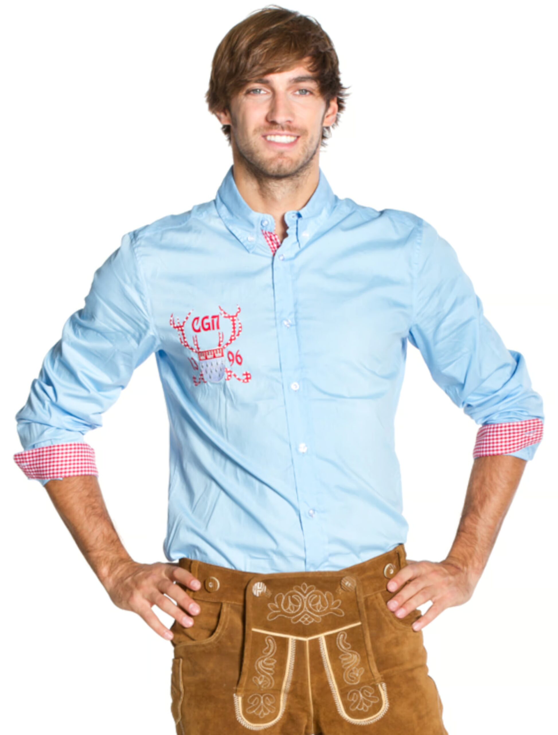 Mit dem hellblauen Micky Brühl Trachtenhemd outest Du Dich in jedem Fall als Fan der Band. Das Baumwollhemd ist in den Größen S bis 5XL erhältlich. Kragen und Ärmelsäume sind rotkariert vom hellblauen Hemdstoff abgesetzt und sind ein schickes Detail. In Rot gehalten sind ebenfalls die Verzierungen des hellblauen Micky Brühl Trachtenhemdes: Vorne auf Brusthöhe befindet sich ein Wappen mit Geweihverzierung und über den gesamten oberen Rücken zieht sich die Silhouette Kölns. Kombiniere das Hemd lässig zu Lederhosen und einer Weste und lass es auf dem nächsten Konzert krachen.