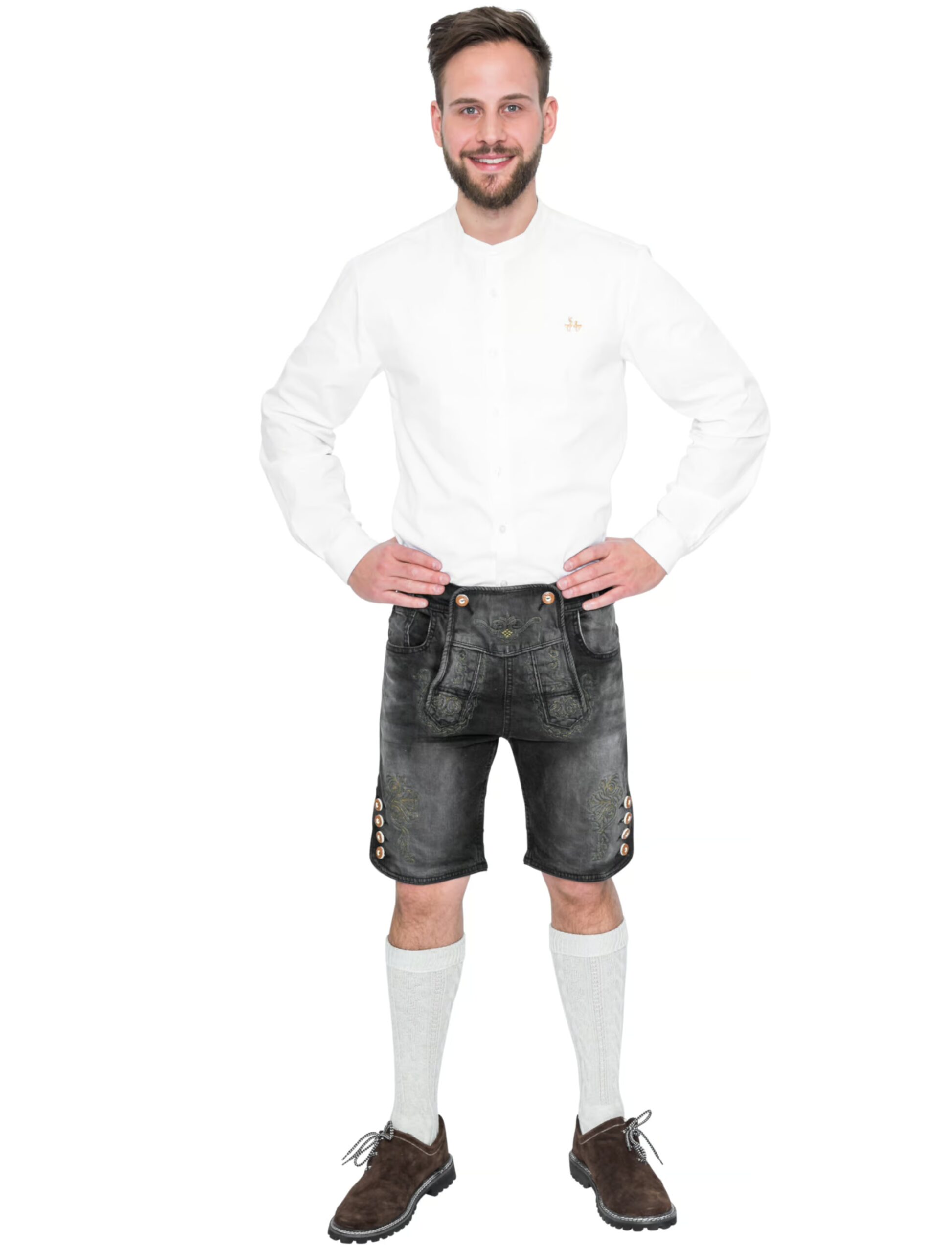 Es muss nicht immer die Krachlederne sein, die Dich zum Hingucker auf dem Volksfest oder einer anderen zünftigen Gaudi macht. Mit der knielangen schwarzen Trachtenjeans aus Baumwolle im angesagten Used-Look sorgst Du bei den Madeln genauso für Aufsehen. Sie ist ein praktisches Multitalent, das sowohl ein attraktives Basic für ein traditionelles Volksfest-Outfit als auch für ein verwegenes Wildschützen-Faschingskostüm ist. Diese Jeans ist am Hosenlatz und an den Hosenbeinen kunstvoll bestickt und mit den traditionellen Hornknöpfen aus Kunststoff ausgestattet. In ihr zeigst Du, zur Freude der Damenwelt, nicht nur Deine knackige Figur, sondern auch Deine strammen Wadeln.