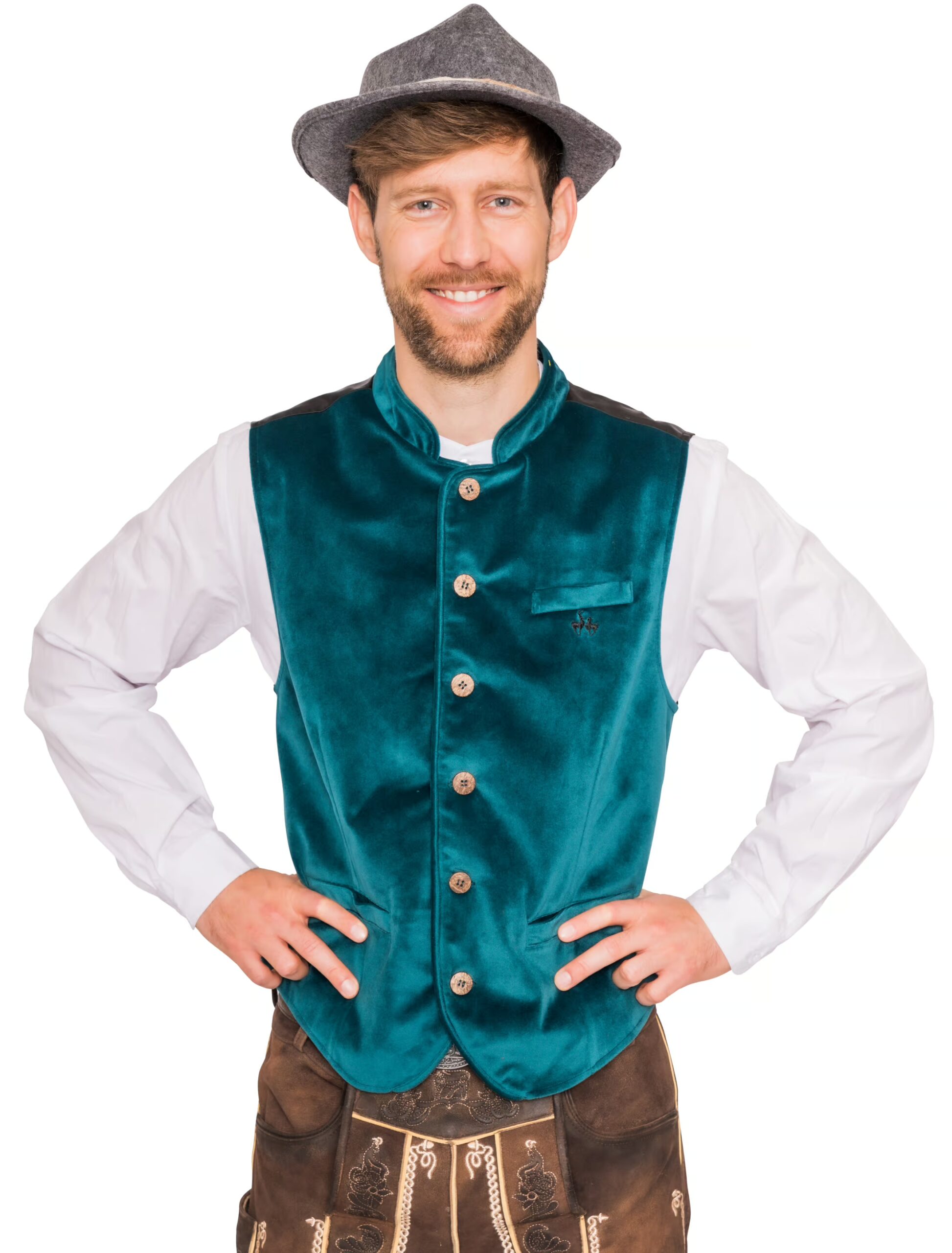 Diese grüne Trachtenweste in Veloursoptik kannst Du nicht nur auf dem nächsten Volksfest ausführen, sondern auch auf der nächsten Kostümparty. Die Weste wird mit Knöpfen in Hirschhorn-Optik geschlossen und hat auf jeder Seite eine provisorisch zugenähte Tasche sowie einen Taschenansatz an der linken Brust. Die Rückseite glänzt mit feinem Satinstoff. Dein Volksfest-Look ist jedoch noch nicht fertig. Kombiniere zu der Weste unsere schicke Lederhose, ein weißes Hemd und einen grauen Filzhut.