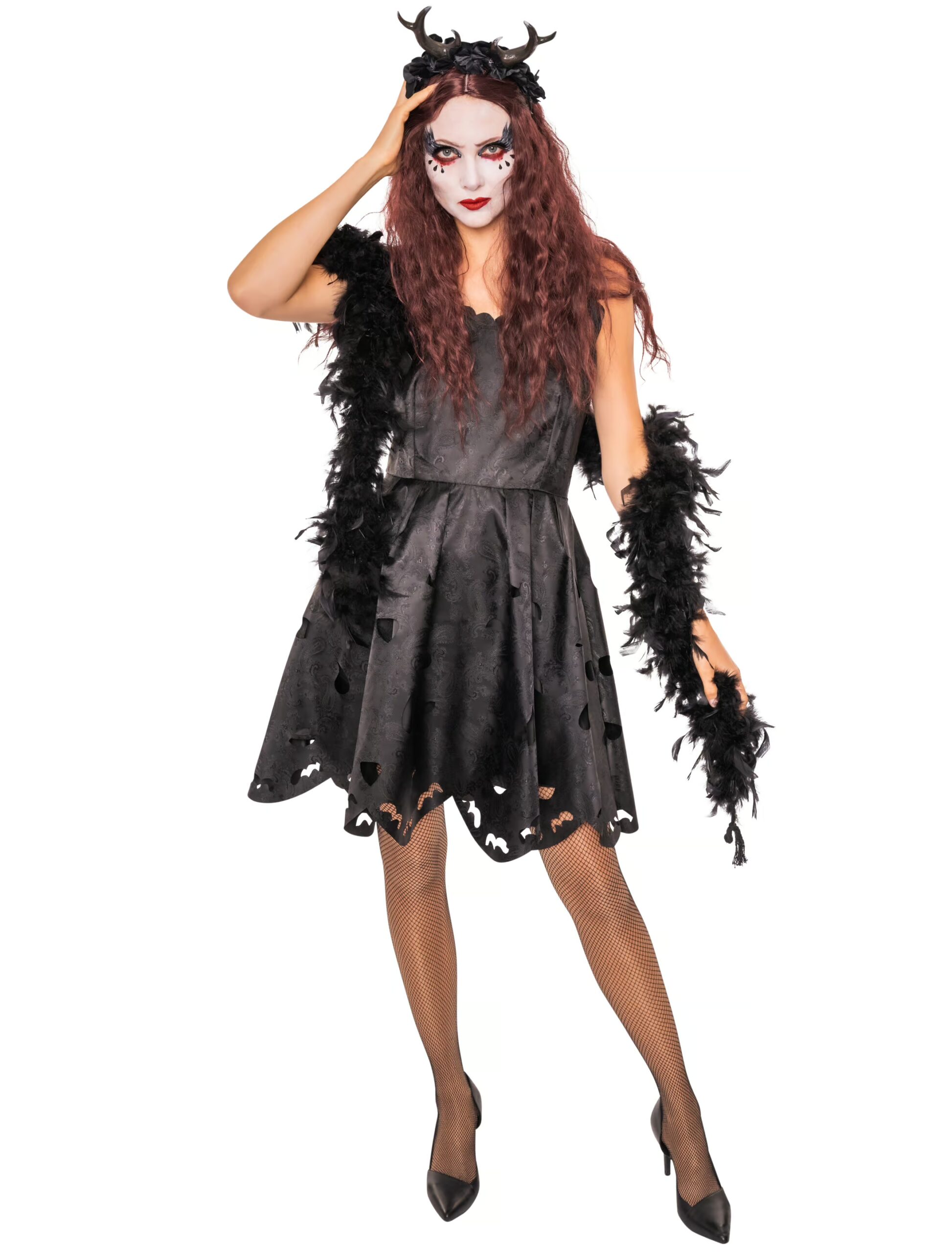 Engel mal anders! Dieses Trägerkleid eignet sich für alle Damen, die sich zur dunklen Seite hingezogen fühlen und Halloween gerne und ausgiebig feiern möchten. Das feminine Kleidungsstück besteht aus einem zweilagigen, schwarzen Stoff mit glänzendem Paisley-Muster. Während die Träger des Engel Kleids mit Federn aus Stoff geschmückt sind, wird der Kleidsaum von Fledermaus-Aussparungen geziert. Ein weiterer toller Hingucker ist der tief ausgeschnittene Rücken. Das schaurig-schöne Kostüm ist nicht nur für Hexen-, sondern auch für Zombie- oder DÃa de los Muertos-Kostüme perfekt geeignet. Fehlen nur noch die passenden Accessoires!