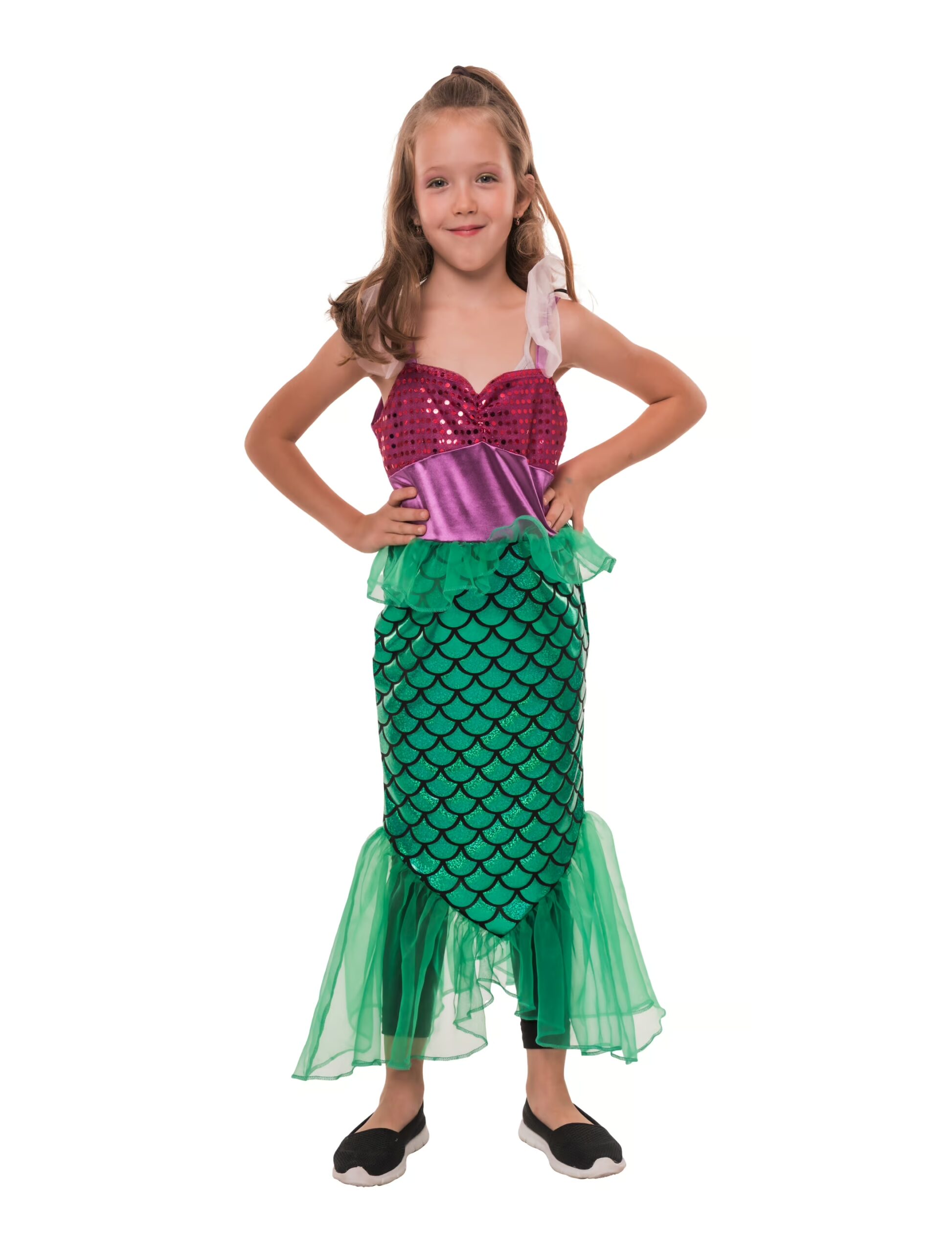 Mit unserem Trägerkleid Meerjungfrau für Kinder wird jeder Karneval zur Unterwasser-Party! Das Kleid ist an Schultern, Hüfte und Saum mit zartem Tüll verziert und schimmert bei jeder Bewegung. An der Seite sorgt ein Reißverschluss für bequemes An- und Ausziehen. Das Oberteil begeistert mit funkelnden Glitzer-Applikationen, während der Rock in Form einer Meerjungfrauenflosse gestaltet ist – perfekt für kleine Meeresprinzessinnen. Für alle, die im Kostüm gern abtauchen und mit Stil wieder auftauchen!