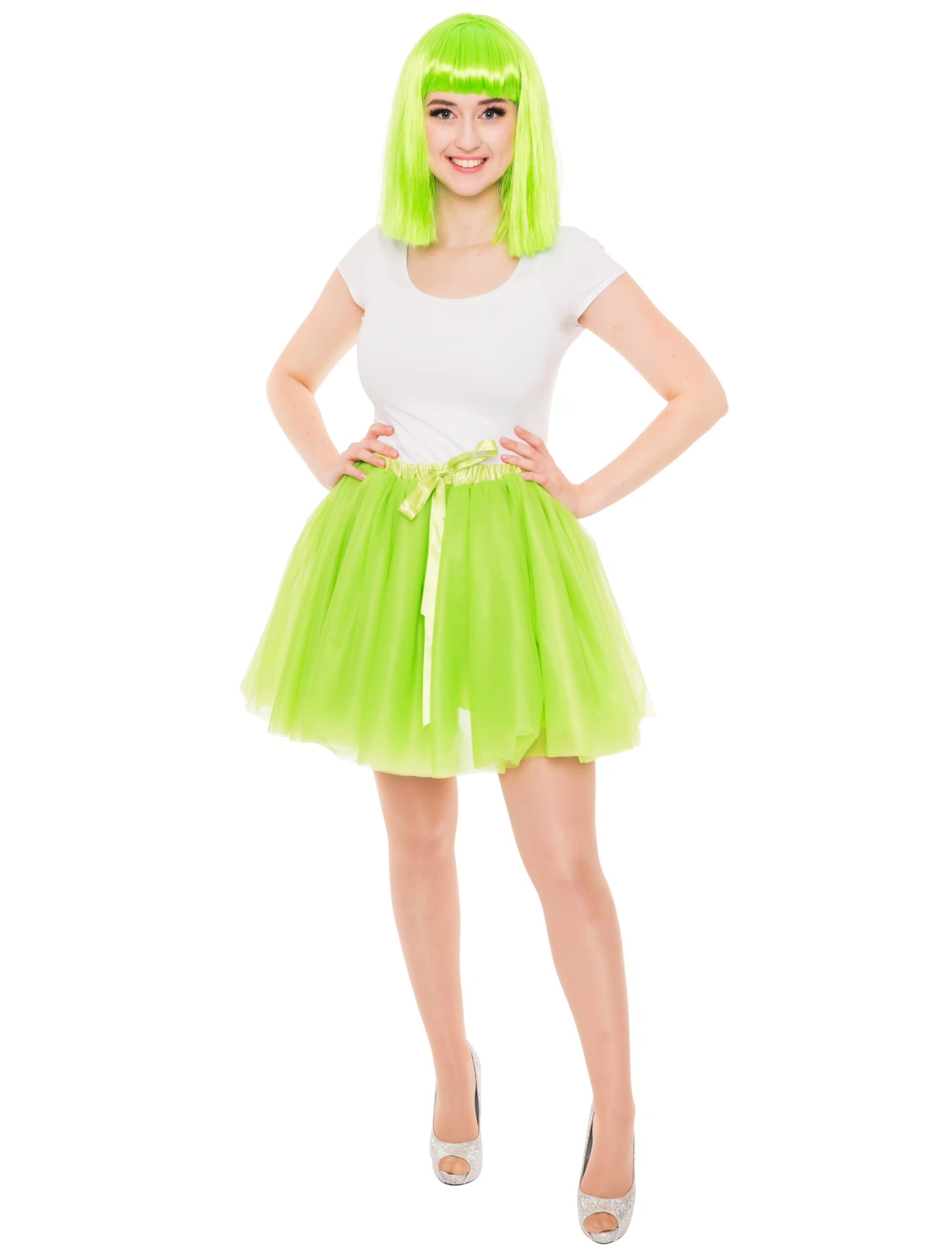 In leuchtendem Neongrün präsentiert sich dieser schicke Tüllrock aus Polyester, der mit seiner kräftigen Farbe alle Blicke auf sich zieht und als Basic für farbenfrohe und fantastisch Kostümierungen zum Karneval und Fasching bestens geeignet ist. Der grüne Rock besteht aus mehrlagigem Tüll sowie einem Satinunterrock und ist mit einem Gummizug samt Bindeband ausgestattet. Du kannst ihn ganz nach Deinen Vorstellungen mit den verschiedensten Kostümteilen und Accessoires aus unserem Shop kombinieren und erfindest so Deinen individuellen närrischen Look, der bestimmt auch den Anderen gefällt.