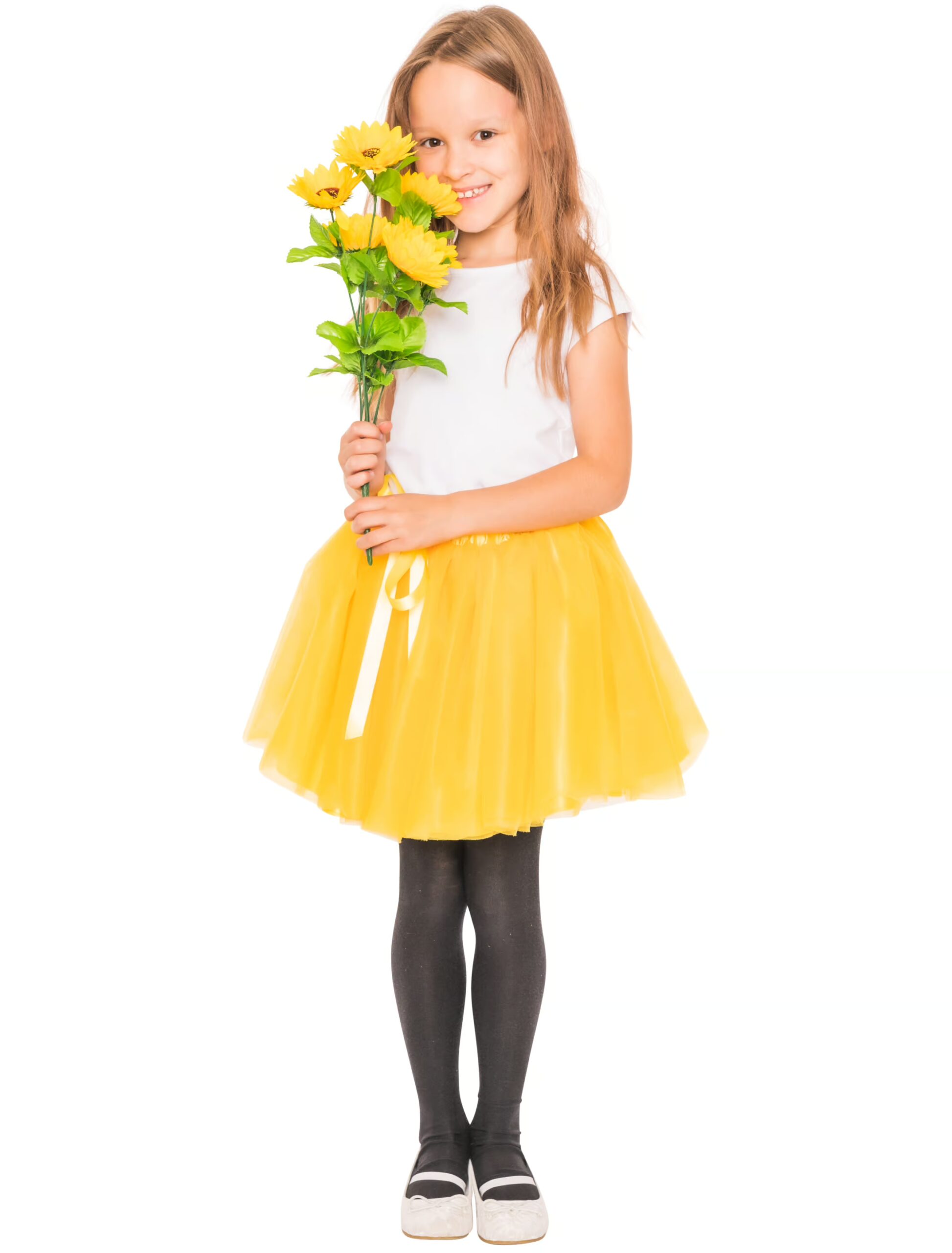 Mit diesem gelben Tüllrock für Kinder kannst Du alles sein: Engel, Elfe oder Blumenmädchen. Der Rock aus Polyester ist in der Taille mit einem Gummizug versehen, sodass er besonders bequem ist und sich mit unterschiedlichen Oberteilen kombinieren lässt. Eine besonders schöne Optik bietet der Rock mit dreilagigem Tüll und einer Lage Satin. Da der Rock nur 33 cm lang ist, ziehst Du am besten eine pfiffige Strumpfhose oder Leggings darunter.