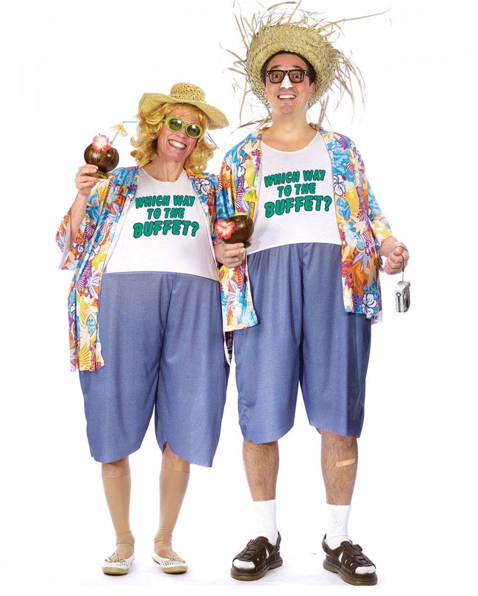 Dicker Tourist Kostüm Das Kostüm Dicker Tourist ist ein kleiner, gemeiner Seitenhieb auf die Pauschaltouristen, die alljährlich Europa überschwemmen. Das Kostüm dicker Tourist besteht aus einem Overall aus zusammengenähter blauer Shorts und weißem T-Shirt sowie aus einem Hawaii Hemd. Der Overall simuliert mit einem Drahtreifen einen riesigen Bauchumfang. Das T-Shirt ist hinten mit einem kleinen Klettverschluss versehen, der einen ausreichenden Einstieg in das Kostüm bietet. Das enorme Hawaii Hemd knopflos und muss offen getragen werden. Auf dem T-Shirt ist die Aufschrift ",which way to the buffet?", (wo geht’s zum Buffet?) aufgedruckt. Lieferumfang: Overall, Hawaii Hemd Material: 100% Polyester Farbe: Blau, Weiß, Hawaii-Hemd Bunt Maße Overall: Durchmesser Bauch ca. 60 cm, Länge ca. 107 cm