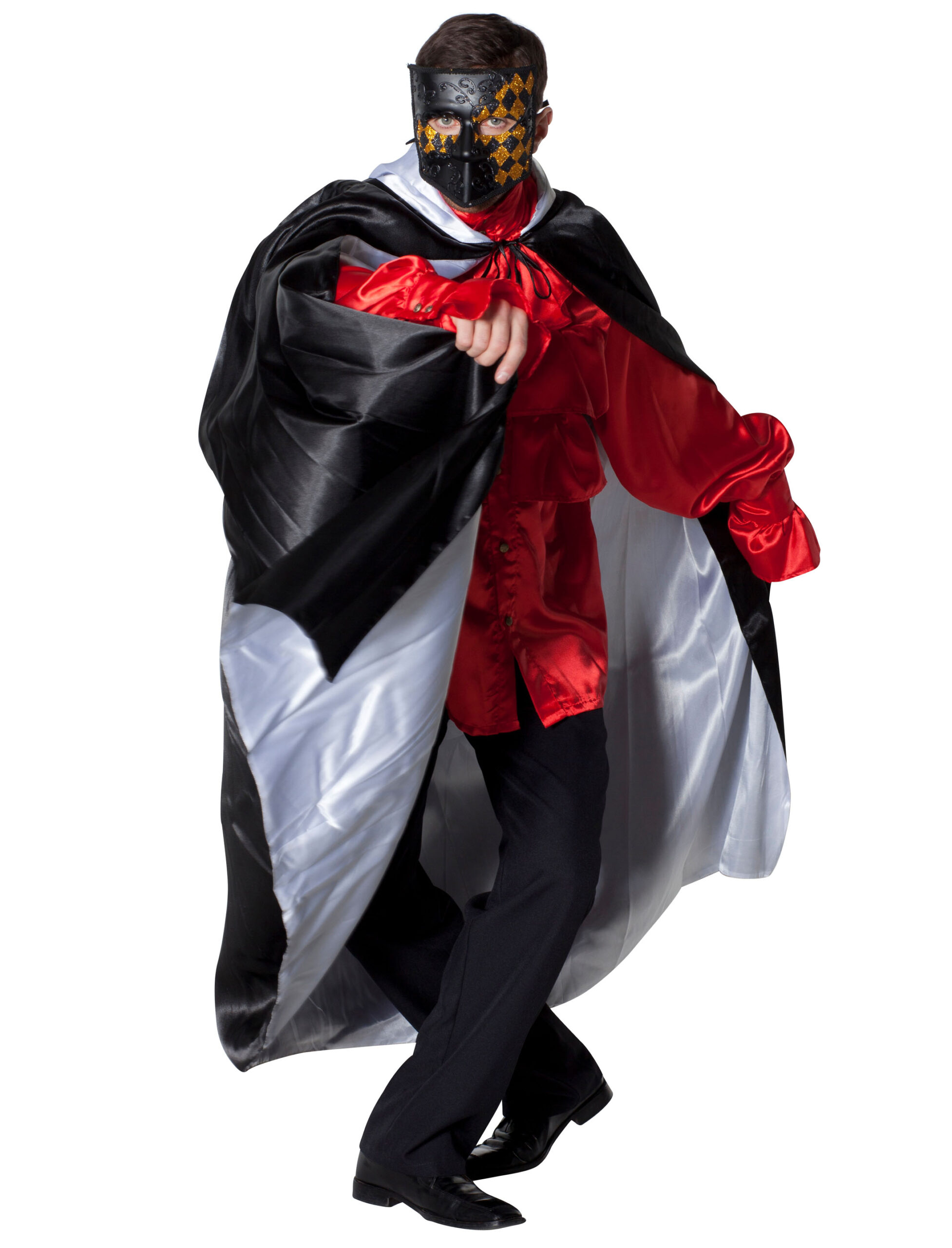Dieser Wende Umhang verleiht Dir garantiert Eleganz und Stil – ob als Kostüm für den Maskenball oder schauriger Graf Dracula an Halloween oder für Deine Karnevalsparty im venezianischen Stil. Die schlichte Farbkombination in Schwarz und Weiß lässt Dich nicht nur schaurig schön sondern auch elegant und unnahbar wirken! Kombiniert mit einer gruseligen Maske oder ein paar passenden Zubehörteilen ist der wendbare lange schwarz-weiße Umhang aus Satin-ähnlichem glänzendem Stoff ein absoluter Blickfang! Die weite Kapuze sorgt für zusätzliche Anonymität und komplettiert Dein Outfit als gruseliges Phantom ideal! Im Halsbereich wird der Umhang geschnürt und befestigt. Der Umhang ist ein wahres Kombinationswunder und wertet garantiert jedes Kostüm optisch auf! Ob auf Deiner Halloween-, Karnevals- oder Mottoparty – mit Stil und Eleganz überzeugst Du die Damenwelt sicher! Wende den Umhang, wie Du es haben möchtest. Ob außen in Weiß oder in Schwarz, das ist ganz Dir überlassen!
