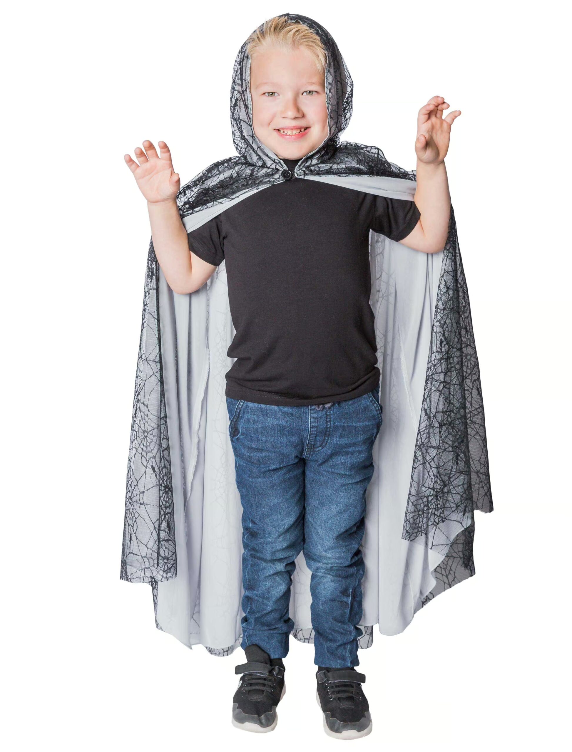 Halloween ist das Fest der Unterwelt! Mit diesem düsteren Umhang für Kinder bist Du perfekt zwischen all den Vampiren, Hexen, Monstern und Vampiren aufgehoben. Der Kinder Umhang besteht aus einem grauen, knöchellangen Stoff, der rundum mit schwarzen Spinnennetzmustern verziert ist. Zusätzlich ist er mit einer Kapuze ausgestattet, die den düsteren Look verstärkt. Unterhalb Deines Halses kannst Du den Spinnen Umhang bequem mit einem Knopf schließen. Dein schaurig-schöner Begleiter für das kommende Halloween.