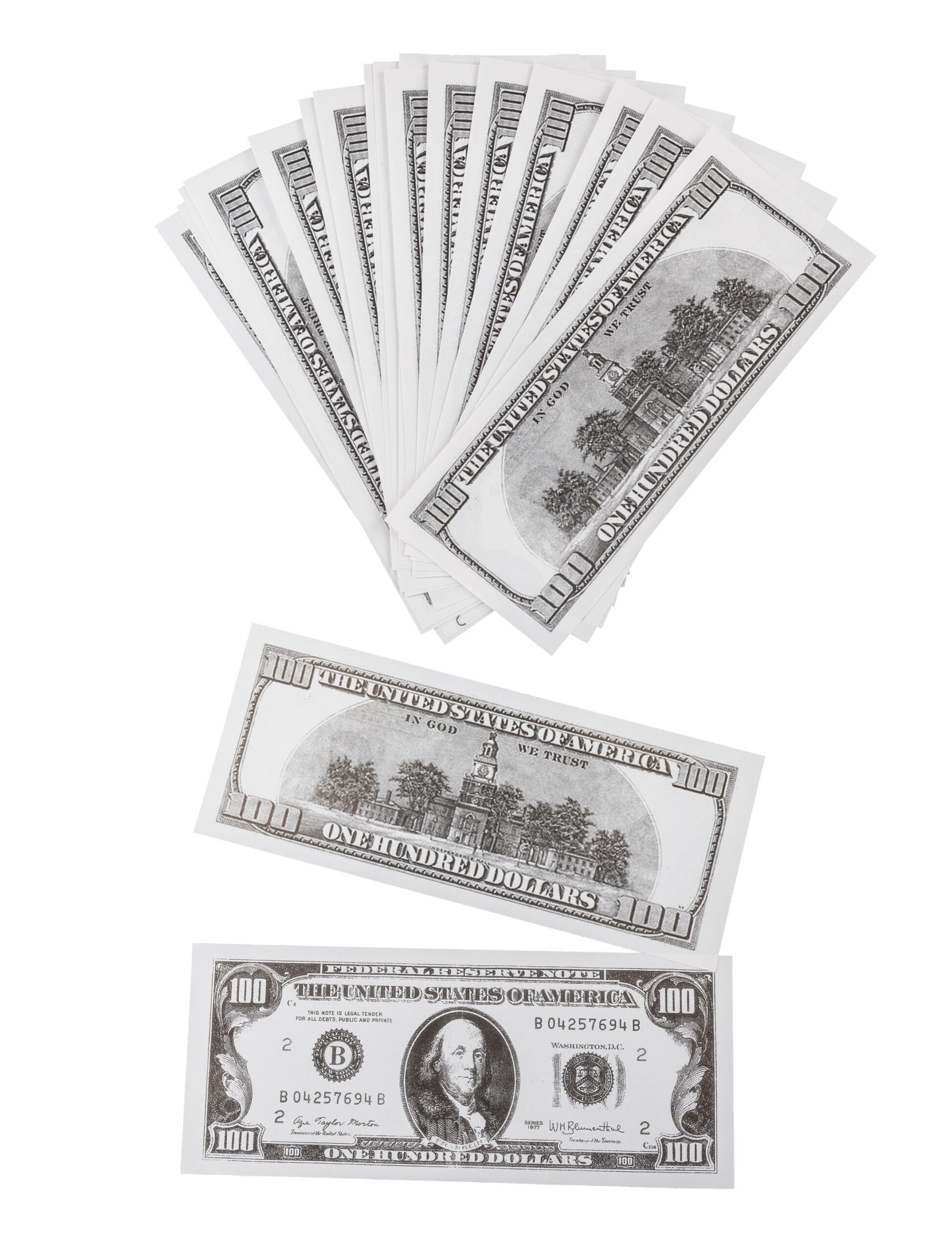 Für Pokerspieler, Lebemänner, Ganoven, Oligarchen und alle, die ihren Reichtum zum Karneval, Fasching und auf Mottopartys öffentlich zur Schau stellen möchten sind unser US Dollar Noten im 20 Stück Bündel ein unerlässliches Extra. Die weiß-grauen Spielgeldscheine mit dem Abbild Benjamin Franklins machen Dich nicht nur interessant, sondern auch zum umschwärmten Partygast, der sich mit den Taschen voller Geld scheinbar alle Wünsche erfüllen kann.