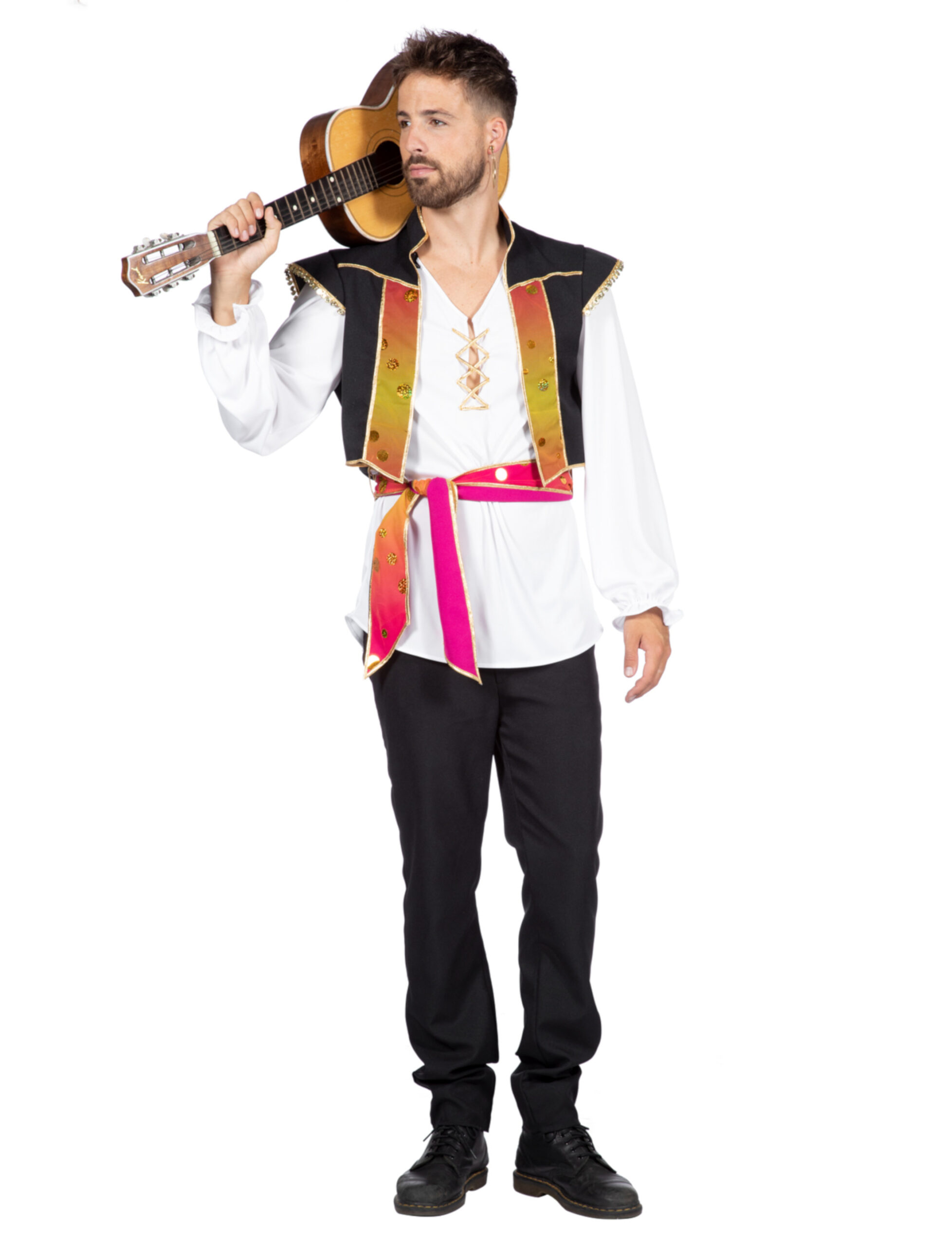 Heute hier – morgen da, immer auf der Suche nach neuen Herausforderungen. Mit diesem dreiteiligen Vagabundenkostüm wirst auch Du ein charmanter Lebenskünstler und Herzensbrecher, der die Freiheit, Unabhängigkeit sowie Leichtigkeit des Lebens, zumindest während der närrischen Zeit so richtig auskosten kann. Das Kostüm besteht aus einem langen, weißen Hemd mit Schnürung, einer kurzen goldverzierten, schwarzen Weste und einer bunten Schärpe. Die passende Hose findest Du bei uns im Shop. In dieser typischen Vagabunden-Kostümierung bist Du ein überaus interessanter und rätselhafter Typ, dem die Herzen der Damen nur so zufliegen werden.