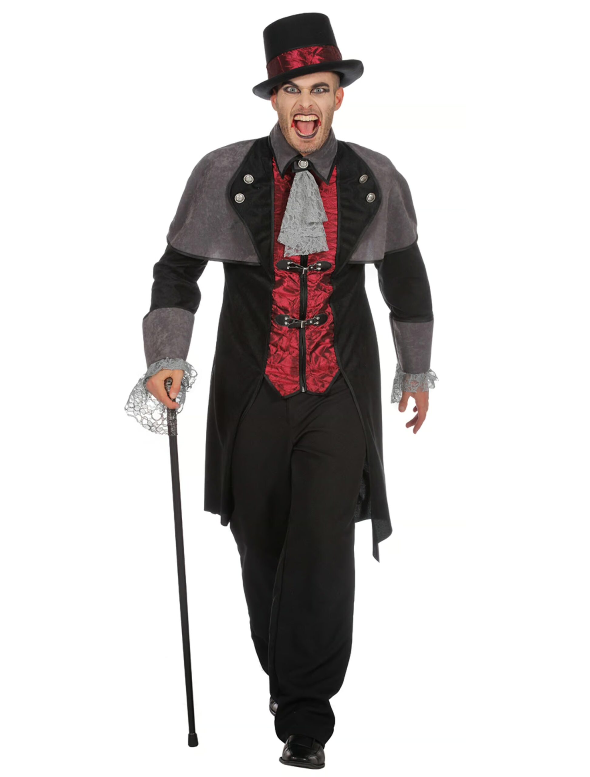 Du hast zur Halloweenparty des Jahres geladen? Dann solltest Du Deine Gäste in Deinem hübschesten Mantel begrüßen: Dieser besteht aus einem schwarzen Stoff, der an den Ärmeln und am ausladenden Kragen mit grauem Stoff verziert ist. Das rote Jackett/Weste, das an den Mantel genäht ist, überzeugt durch den knallroten Stoff, den Schnallen in der Front und den Kragen und dem angenähten Jabot, das passend zu den Mantelärmeln aus weißer Spitze besteht. Dazu passen Vampirzähne, ein Hut und ein Gehstock und schon verwandelst Du Dich in einen edlen Blutsauger!