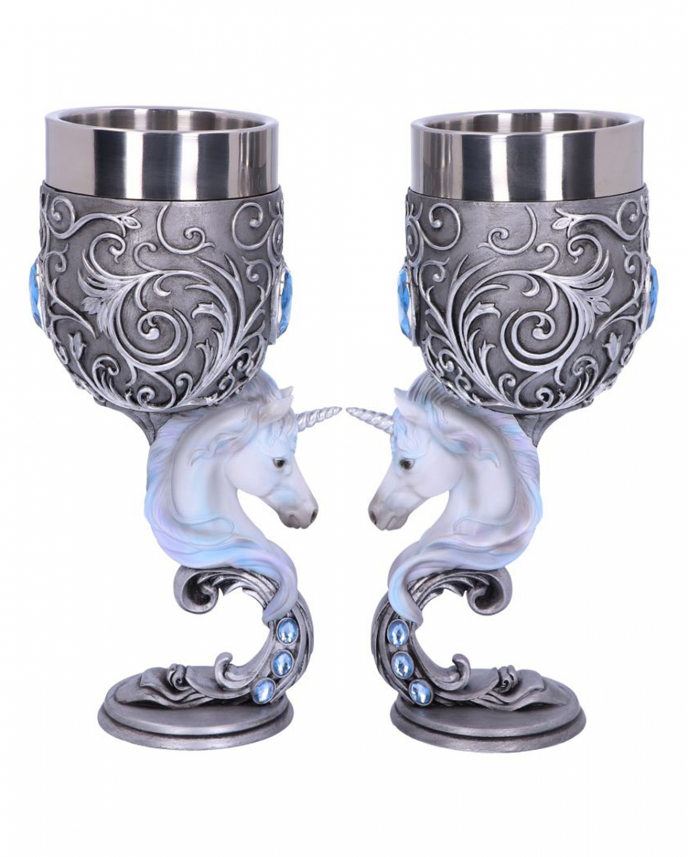 2 Stück Fantasy Einhorn Kelche als Set Verschenke die Kelche mit Einhörnern, die zusammen eine Herzform ergeben, an einen Fantasy Fan Die Fantasy Einhorn Kelche sind mit aufwändigen silbernen Barockdetails verziert. In der Mitte des Stiels befindet sich der Kopf eines weißen Einhorns. Darüber strahlt ein eisblauer Edelstein. Damit bringst du mystisches Flair auf den Tisch. Die Fantasy Einhorn Kelche sind aus hochwertigem Polyresin gegossen und von Hand bemalt. Nebeneinander stehend ergeben die Kelche eine Herzform. Beide Kelche wurden mit einem herausnehmbarem Edelstahleinsatz versehen und können einfach gereinigt werden. Lieferumfang: 1 x Fantasy Einhorn Kelche 2 St. Inhalt: 2 Stück Farbe: Weiß, Silber,Blau Größe: ca. 18,5 cm Höhe Gewicht: 1,15 kg Material: Polyresin (Kunststein), Edelstahl 2 Stück Pastellfarben Einhornkelche als Set Zusammenstehend ergeben diese eine Herzform Herausnehmbarer Edelstahleinsatz Aus hochwertigem Polyresin gegossen Liebevoll von Hand bemalt Nicht für Kinder unter 3 Jahren geeignet. Kann Kleinteile enthalten, die verschluckt werden können – Erstickungsgefahr. Von Feuer und offenen Flammen fernhalten.