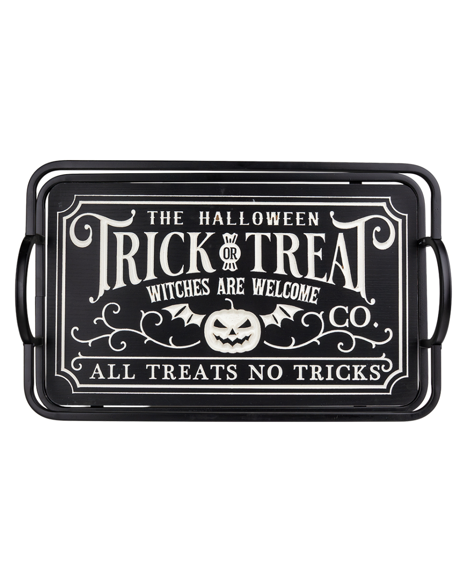 Halloween Holztablett ",Trick or Treat", im Farmhouse Style 45cm Hölzernes Trick or Treat Tablett zum Servieren von Süßigkeiten Unser schönes Halloween Holztablett ",Trick or Treat", im Farmhouse Style sorgt für spooky Stimmung. Serviere leckere Bonbons und Schokoriegel zum Trick or Treat, oder nutze das Tablett als dekorativen Blickfang in der Küche. Das Trick or Treat Witches Are Welcome", Tablett ist aus Holz gefertigt und im schwarz-weißen Design gehalten",. Dank zweier seitlicher Griffe lässt sich das Tablett einfach tragen. Lieferumfang: 1 x Halloween Holztablett ",Trick or Treat", im Farmhouse Style 45cm Farbe: Schwarz, Weiß Größe: ca. 45 cm Material: Holz, Metall Hölzernes Halloween Tablett Küchen Deko für Halloween Serviertablett im Trick or Treat Design Gruseliges Hexen Tablett Der Artikel ist ein Dekoartikel. Nicht für Kinder unter 3 Jahren geeignet. Kann Kleinteile enthalten, die verschluckt werden können – Erstickungsgefahr. Von Feuer und offenen Flammen fernhalten.