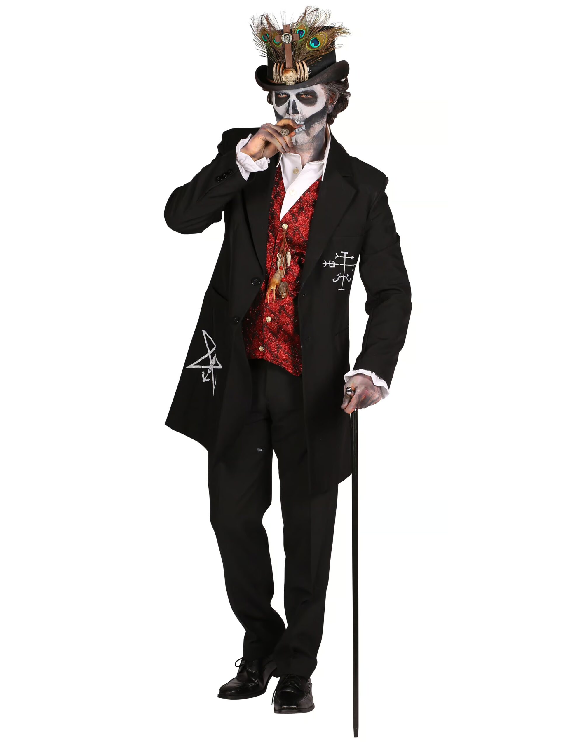 Die perfekte Komplettlösung für jeden Voodoo Meister an Halloween! Dieses düstere Herren Kostüm besteht aus einer schwarzen Jacke mit detailreichen und authentischen Voodoo-Symbolen, aus einem Hemd und aus einer schicken Weste in Rot und Schwarz, die mit einer braunen Kordel und mit Federn und Perlen geschmückt ist. Der figurbetonte Schnitt des Kostüms verwandelt Dich in den eindrucksvollsten Voodoo Meister weit und breit.