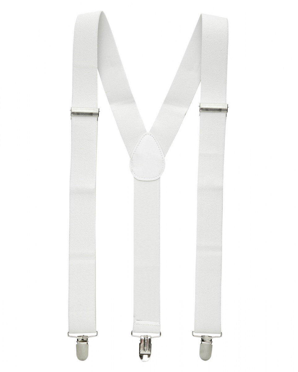 Elastische Hosenträger weiß Klassische Hosenträger als Kostümzubehör Weiße Hosenträger aus elastischem Stoff mit silbernen Clips. Klassische Hosenträger für dein Karnevals und Faschings Kostüm Heute sind die edlen, weißen Hosenträger wieder hochmodern und ein sehr beliebtes Modeaccessoire. Die klassischen Hosenträger sind elastisch und dehnbar. An den vorderen zwei Enden der Hosenträger und am Ende des hinteren Trägers befindet sich je ein silberner Metallclip zum Befestigen an der Hose. Lieferumfang: 1 Paar Hosenträger Farbe: weiß Größe: Länge verstellbar, Breite ca. 3,5 cm Material: 100% Polyester Achtung, nicht für Kinder unter 36 Monaten geeignet, enthält Kleinteile die verschluckt werden können