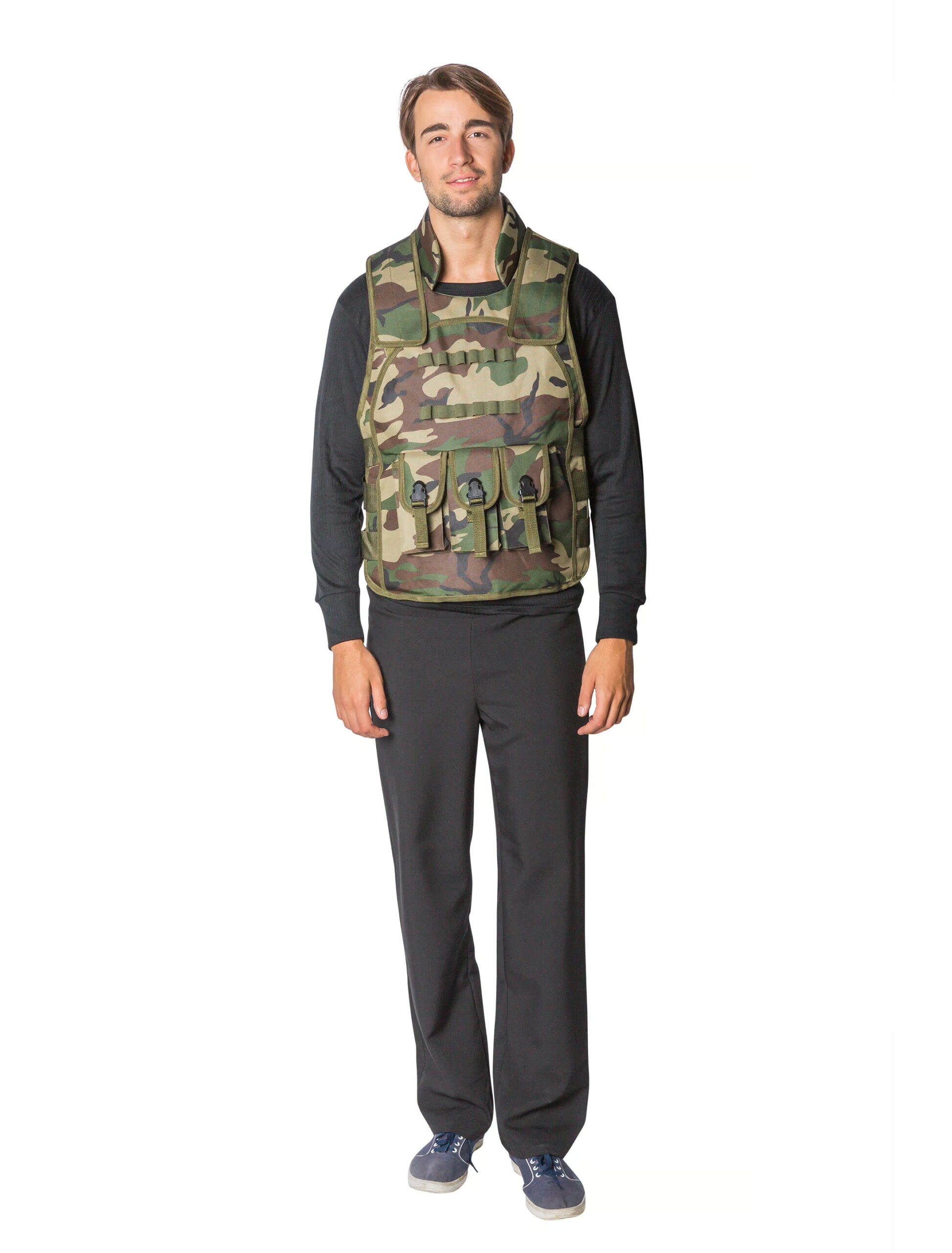 Gut getarnt im Wald, aber der Mittelpunkt auf der jeder Party! Mit dieser Weste in einem grün-braun-beigen Camouflage-Muster kannst Du Dich auf keiner Party unsichtbar machen. Denn der authentische Bundeswehr-Look fällt garantiert auf. Die Front der Herren Weste ist mit zahlreichen Applikationen verziert, zum Beispiel mit drei Taschen, die Stauraum bieten oder anderen olivfarbenen Elementen. Auch die Rückseite ist mit zwei Taschen verziert. Durch nicht-sichtbare Klettverschlüsse im Schulterbereich und an den Seiten lässt sich die Camouflage Weste bequem schließen. Der taillierte Schnitt und der Stehkragen runden Deinen schicken Auftritt perfekt ab.