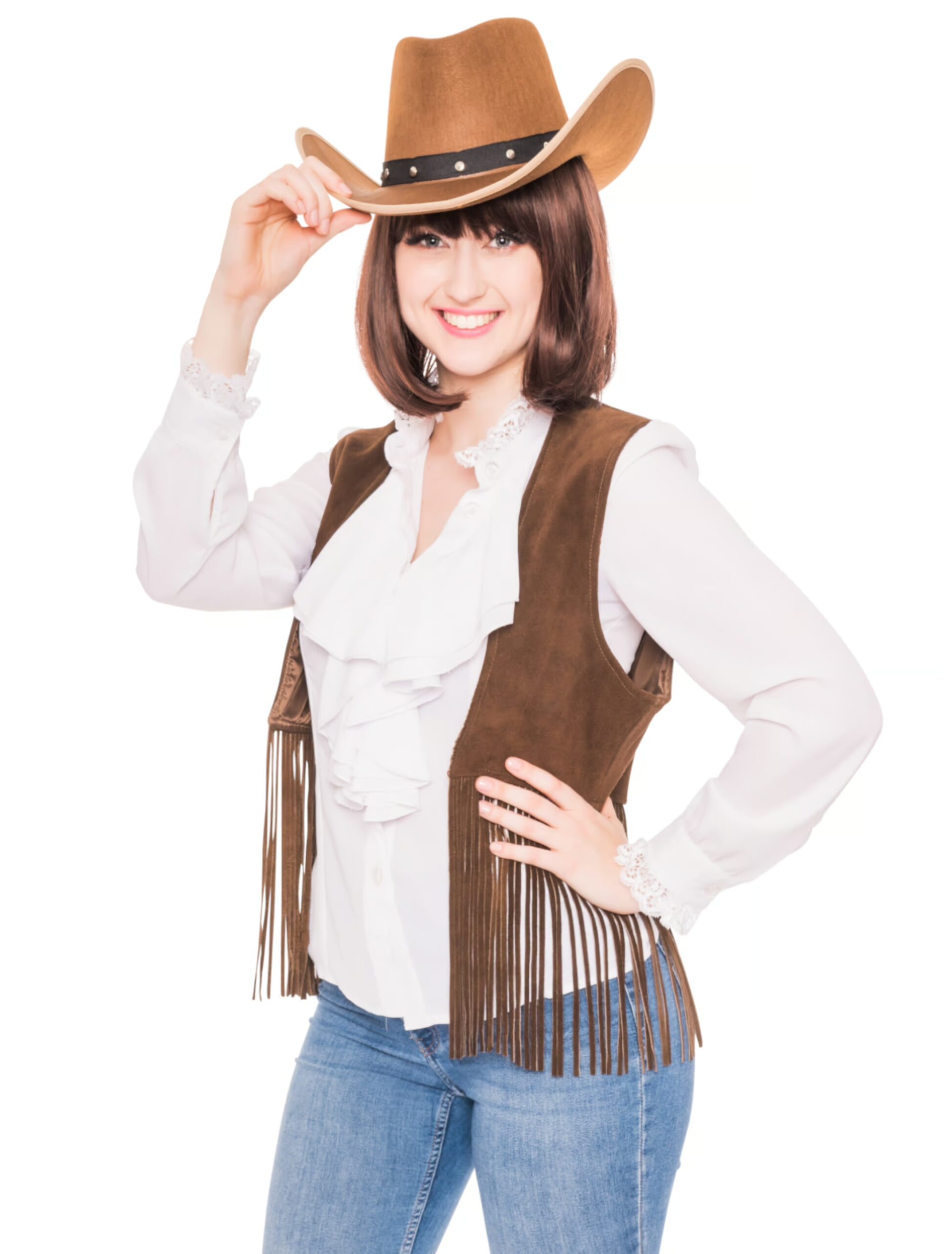 Mit dieser schicken Cowboy Weste für Damen und einer robusten Jeans sowie Cowboystiefeln und Cowboyhut hast Du ein perfektes Faschings- und Karneval-Outfit um das man Dich sicher beneidet. Die dunkelbraune, offene Weste aus feinem Rindsleder im Westernlook, mit der praktischen Innentasche und den langen Fransen macht aus Dir ein super Cowgirl, das nicht nur den Cowboys im Wilden Westen, sondern auch so manchem Gast auf Motto-Partys, Events und zum Fasching und Karneval den Kopf verdreht.