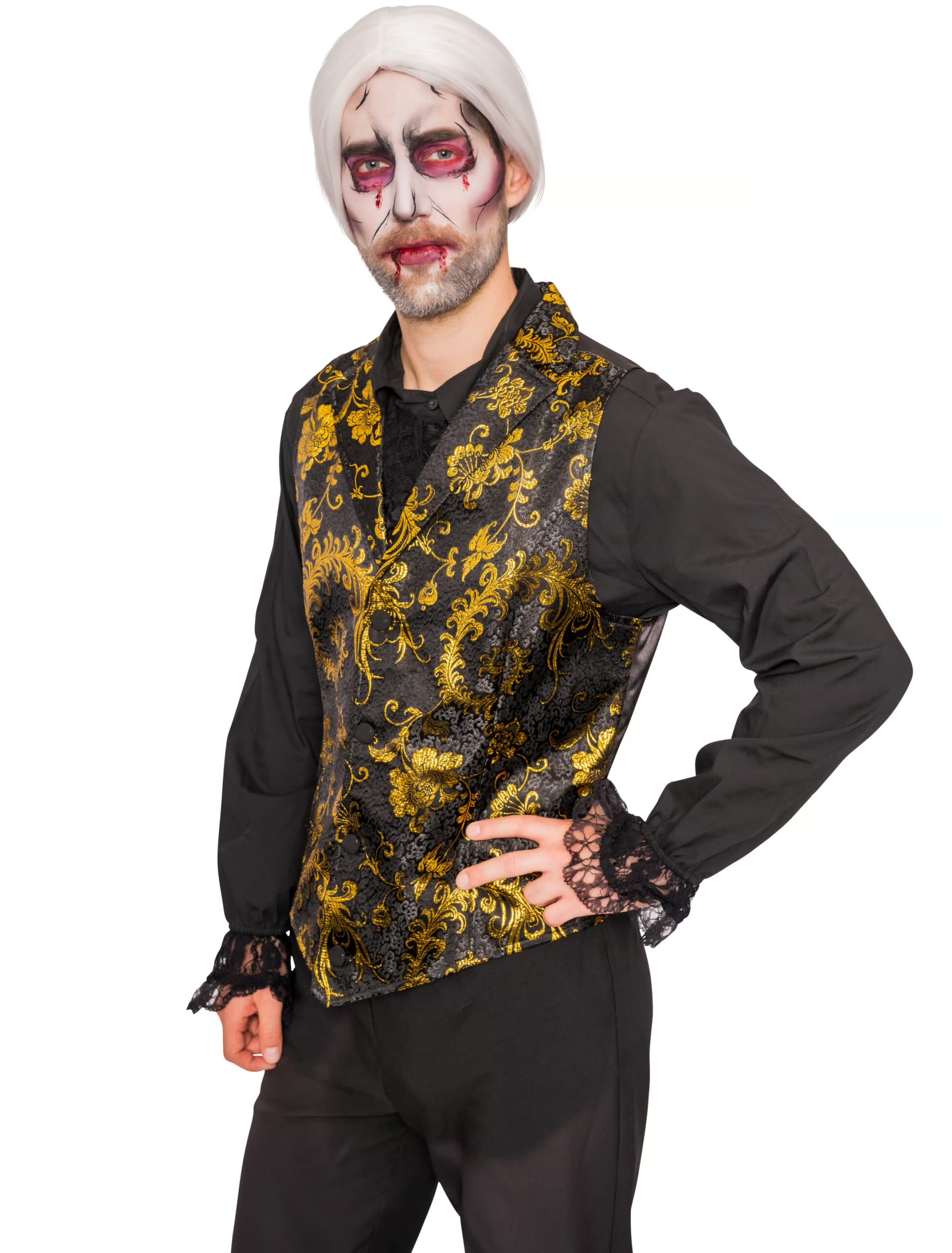 Du möchtest den ultimativ eleganten Auftritt auf der nächsten Kostümparty? Dann ist diese elegante schwarzgoldene Weste mit Brokat-Muster und verstellbaren Rückenteil aus Satin genau das Richtige für Dich. Die leichte Weste aus Polyester mit Knopfleiste in der Front ist angenehm zu tragen und passt hervorragend zu unserem schwarzen Rüschenhemd mit Spitzen an den Ärmeln. Deinem glanzvollen Auftritt als viktorianischer Adelsherr steht nichts mehr im Wege. Mit weißer Gesichtsschminke und grauer Perücke verwandelst Du Dich in einen Vampir.