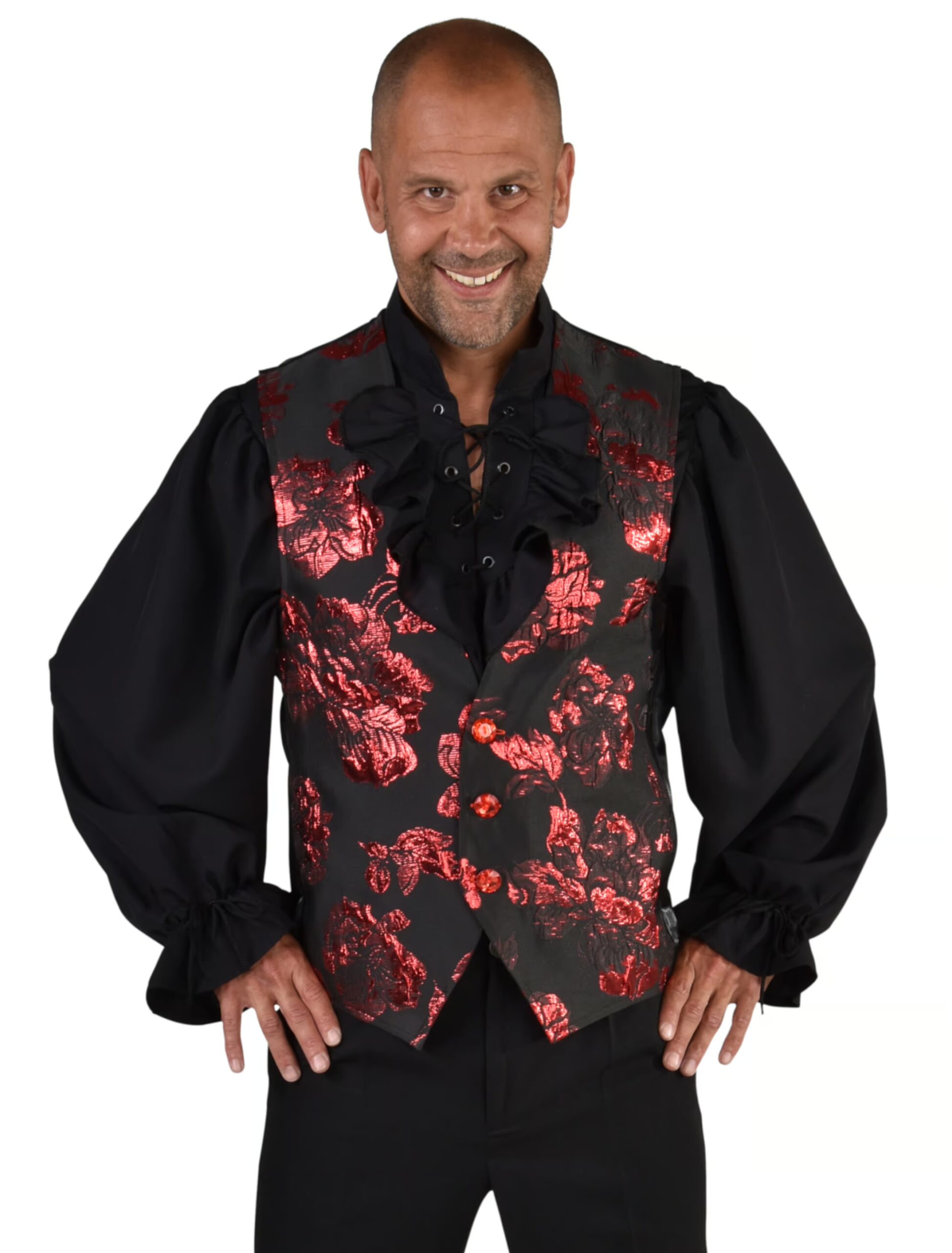 Mit dieser super stylischen Brokat Weste mit glänzenden roten Rosen komplettierst Du Dein Outfit als Rosenkavalier. Zeitlose Eleganz, die bei den Damen immer gut ankommt. Dazu bietet Dir die schicke und angenehm zu tragende Weste viele Kombinationsmöglichkeiten in viele Richtungen wie gewagt, seriös, lässig oder aufgeregt. Ein klassisches Kleidungsstück also, mit dem Du im Karneval immer richtig liegst, und das Dir viele Jahre lang Freude machen wird. Der Gentleman kommt nach wie vor bei den Damen gut an.