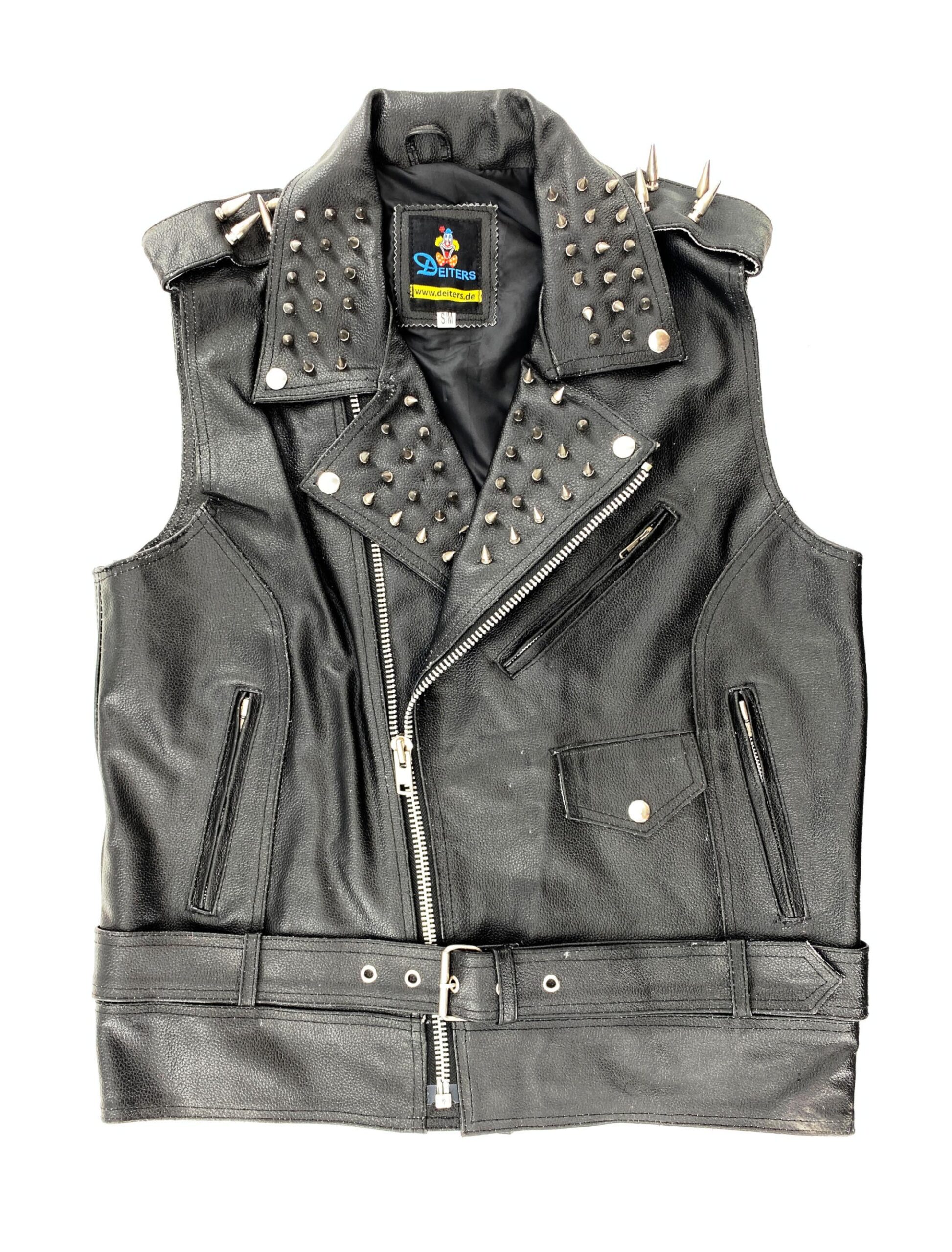 Ein echter Eyecatcher bist Du in dieser super coolen, nietenbesetzten Punker Herrenweste aus hochwertigem, schwarzen Rindsleder, in der Du nicht nur zum Fasching, Halloween oder auf Mottopartys auffällst, sondern auch im Alltag punktest. Das angesagte Teil mit den spitzen Nieten an Kragen und Schulterklappen sowie den weiteren attraktiven Metall-Details an Taschen und Gürtel wird mit einem langen Reißverschluss geschlossen. Diese Punker Lederweste ist Dein persönliches Statement, das bei den Damen gut ankommt.