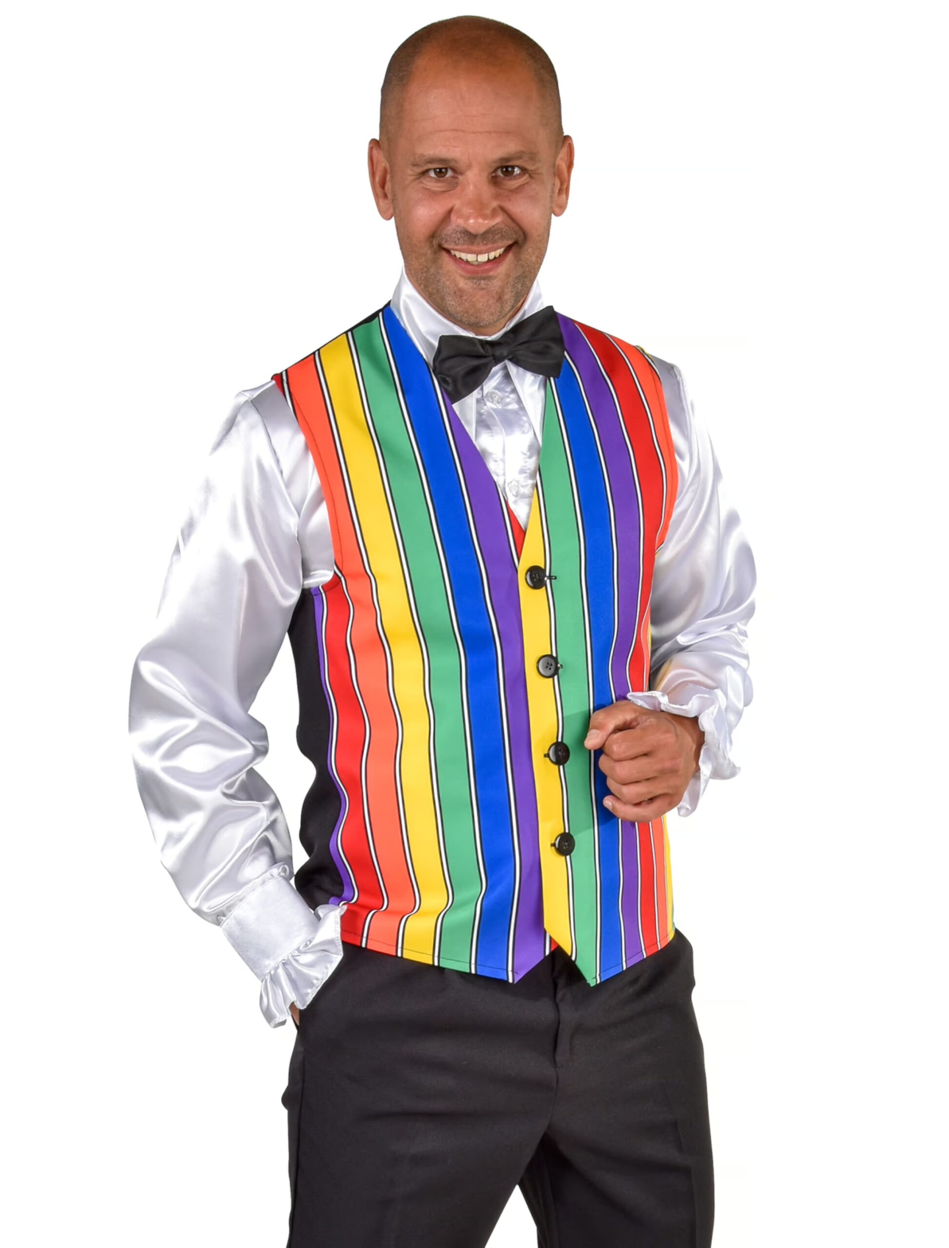 Sehr schick wirkt diese regenbogen gestreifte Herrenweste, die als attraktives Basic für individuelle Kostümideen mit den unterschiedlichsten Kostümteilen aus unserem Shop harmonisch aber auch schrill kombiniert werden kann. Sie besteht aus pflegeleichtem Polyestermaterial und wird mit vier schwarzen Knöpfen geschlossen. Die farbigen Längsstreifen und der körpernahe Schnitt lassen Dich optisch schlanker erscheinen. Mit einem weißen Hemd und einer dunklen Hose bist Du auf der nächsten Kostümparty der adrett gekleidete Barkeeper, dem die Damen ihre Geheimnisse anvertrauen.