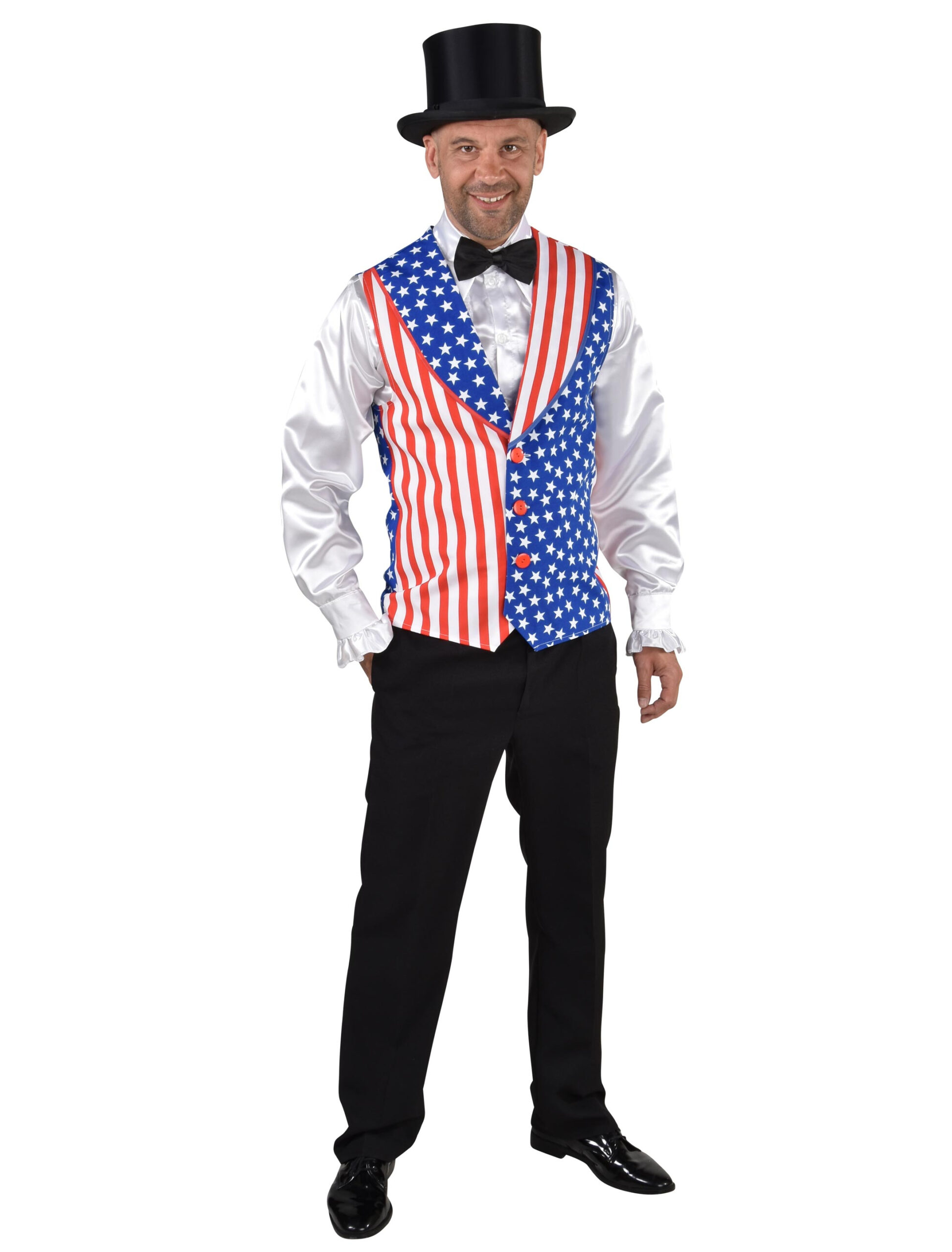 Mit dieser Herren-Weste im typischen US-Look bist Du der Star auf jeder Kostümparty. Die rot-weiß-blaue Weste aus hundert Prozent Polyester macht aus Dir einen echten Kerl. Deine Freunde werden sicherlich neidische Blicke auf Dein Kostüm werfen. Freue Dich auf ein unvergessliches Erlebnis beim nächsten Fasching, denn dann wirst Du Dich mit Deinem Kostüm von anderen Gästen deutlich abheben.