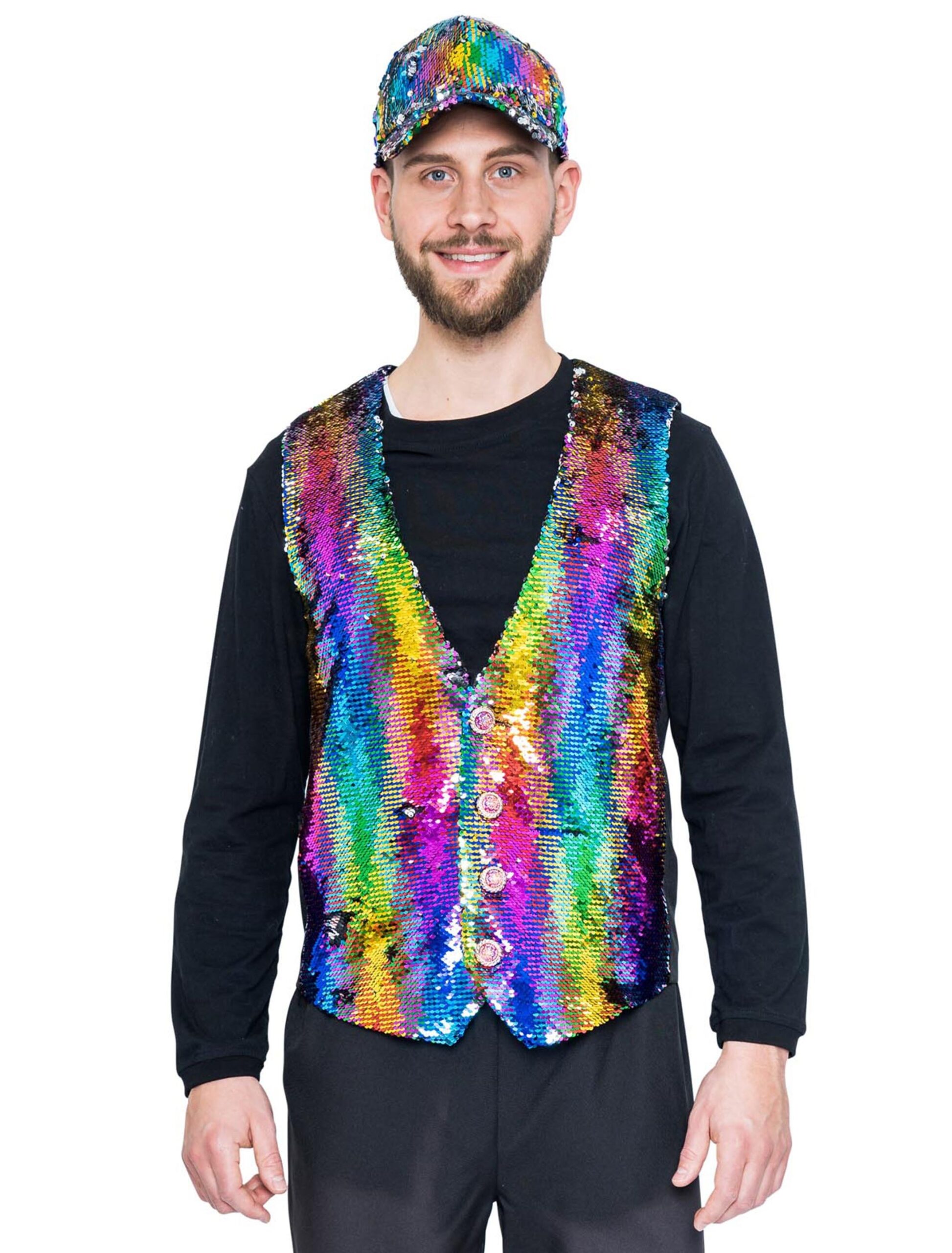 Wow! An dieser Weste für Herren kann man sich nie satt sehen, denn sie sieht immer wieder anders aus! Das Kleidungsstück ist kurz geschnitten und besitzt in der Front vier Knöpfe mit Kunststoff-Kristallen. Highlight sind die Wendepailletten in der Front, die je nach Lage und Lichteinwirkung immer anders um die Wette strahlen. Ein schillerndes Highlight für alle, die es ausgefallen lieben! Ideales Kostümteil für den nächsten Christopher Street Day (CSD)!