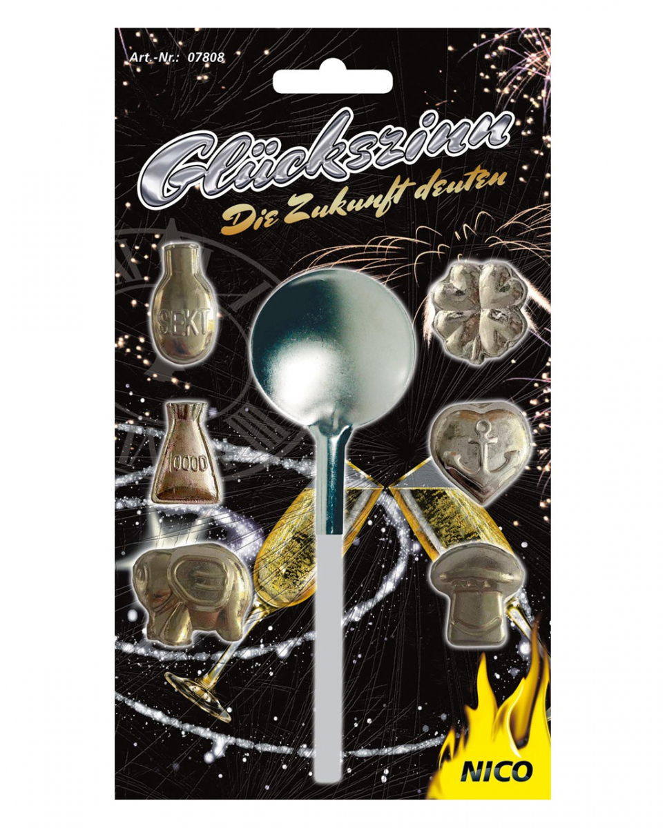 Zinngießen Set Orakel Set zum Erraten deiner Zukunft in der Silvesternacht Zinngießen ist, wie das frühere Bleigießen, eines der ältesten und beliebtesten Mittel in die Zukunft zu sehen. Vor allem an Silvester ist das Orakel lesen aus geschmolzenen Zinnfiguren ein oftmals angewendeter Brauch. Wann lässt sich die Zukunft besser voraussagen, als direkt am Beginn eines neuen Jahres? Das Set zum Zinngießen besteht aus insgesamt 6 Glücksfiguren, welche aus flachem Zinn gefertigt sind, sodass die Wärme der Kerze das Zinn schneller schmelzen lässt. Neben den Figuren erhältst du einen Löffel mit Holzgriff (wird nicht heiß) und ein Orakelheft, damit du weißt, was deine geschmolzenen Figuren bedeuten. Du benötigst zum Zinn-Gieß Set also lediglich noch eine Schüssel mit kaltem Wasser und eine feuerfeste Unterlage, sowie eine Wärmequelle – z.B. eine Kerze, und schon kann es mit dem Zinngießen und dem Vorhersagen der Zukunft losgehen. Eine ausführliche Gebrauchsanweisung findest du auf der Rückseite der Verpackung. Lieferumfang: 1 x Zinngießen Set Bestehend aus 6 Flachfiguren, Gießlöffel mit Holzgriff, Orakelheft Jugendfrei ab 12 Jahren Beaufsichtigung von Erwachsenen erforderlich